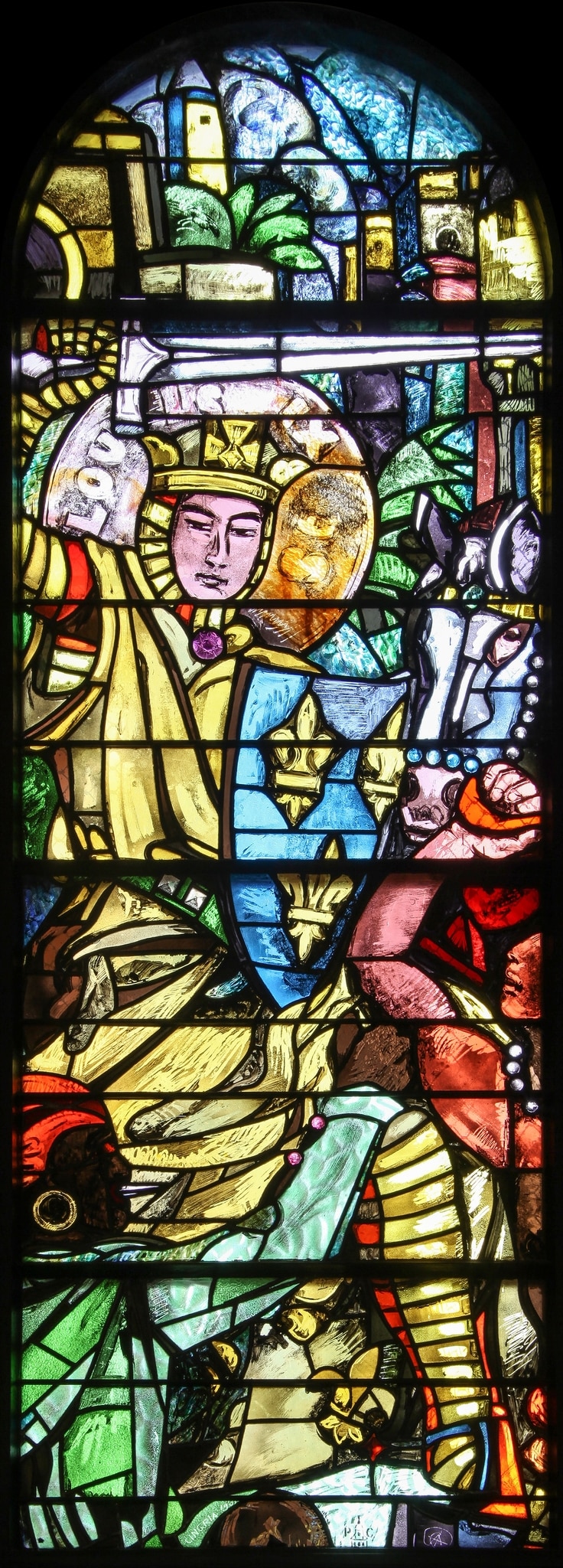 Dans une fenêtre en plein cintre, Louis IX, auréolé et coiffé d’une couronne et vêtu d’un surcot doré, chevauche un cheval dont la tête apparaît à droite du vitrail. Le roi s’apprête à frapper de son épée, levée au-dessus de sa tête, un ennemi à la peau foncée, vêtu de vert, qui tend le bras vers sa jambe pour le désarçonner. Il se protège le corps de son bouclier orné des fleurs de lys de la royauté française, tandis qu’un troisième personnage au torse nu l’attaque sur la droite. A l’arrière-plan se devinent les contours d’une ville orientale.