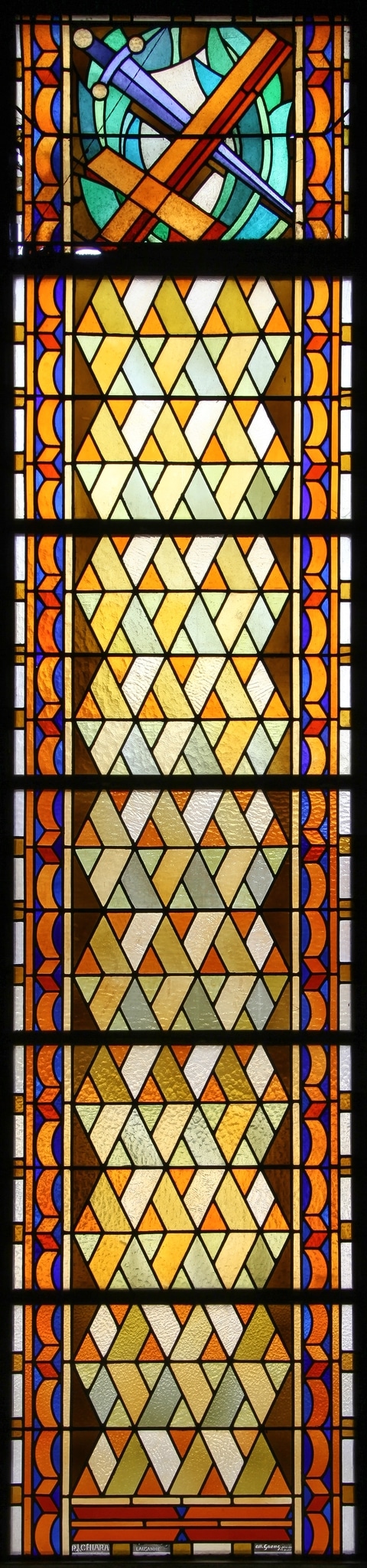 Il apparaît clairement que les vitraux n’ont pas été l’élément principal de la décoration de l’église, contrairement à la céramique, traitée à la manière de la mosaïque, que l’on retrouve partout dans l’édifice. Bien qu’il s’agisse d’un choix esthétique délibéré, nous pouvons tout de même nous demander si c’est aussi par manque de moyens financiers que des vitraux géométriques (bien moins chers que des vitraux narratifs), ont été choisis.
