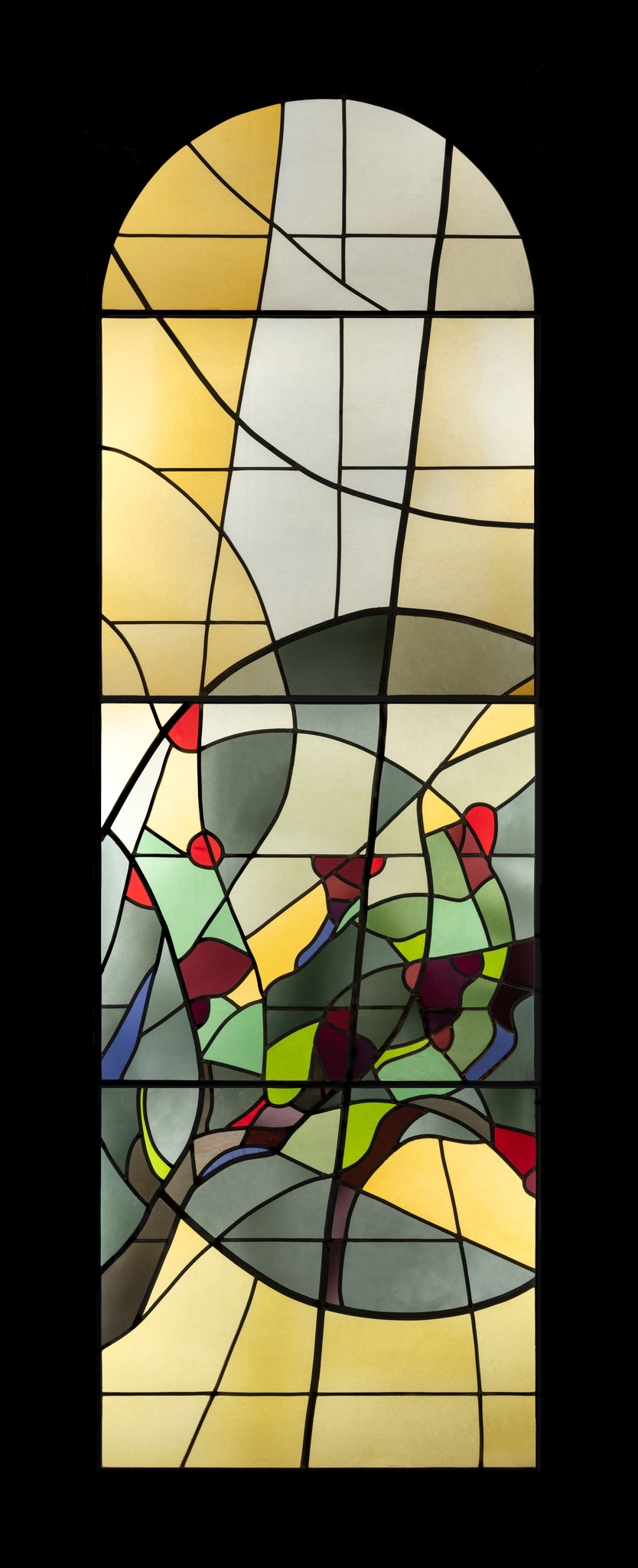 Au bas du vitrail, deux arbres côte à côte sont inscrits à l’intérieur d’un cercle souligné par un plomb plus large que les autres. Ils se dressent en diagonale, des fruits rouges apparaissant sur certaines branches sur un fond abstrait composé de différentes teintes de vert, gris et jaune. Ces deux dernières couleurs composent l’arrière-plan abstrait du vitrail, dans un dégradé de tonalités. Une forte diagonale en plomb traverse le vitrail pour monter jusqu’au sommet, coupée par des lignes horizontales.