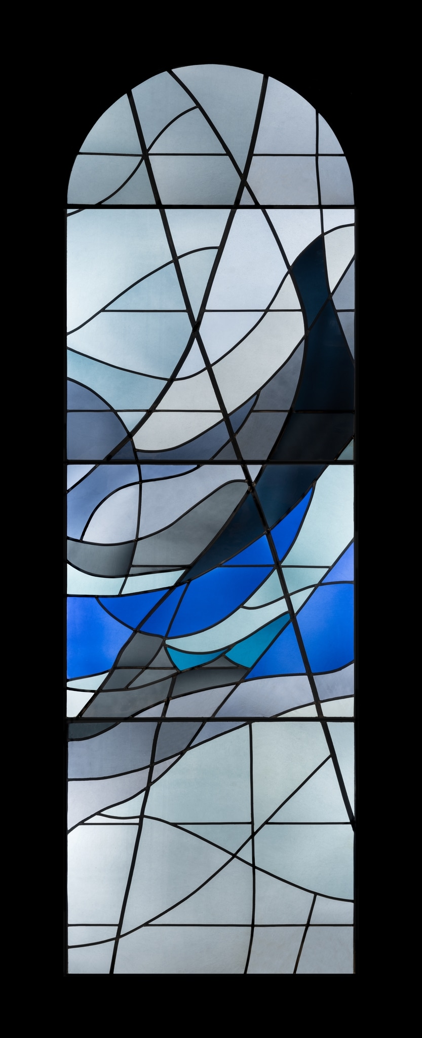 Au centre du vitrail, un vent représenté par des courbes et des contre-courbes dans des teintes de différents bleus et gris se déplace en montant vers la droite. Une diagonale de plomb plus large, traversant le vitrail de bas en haut se dresse dans le sens contraire du courant, croisant dans la partie supérieure de la verrière une courbe, qui pour sa part suit la direction du vent.