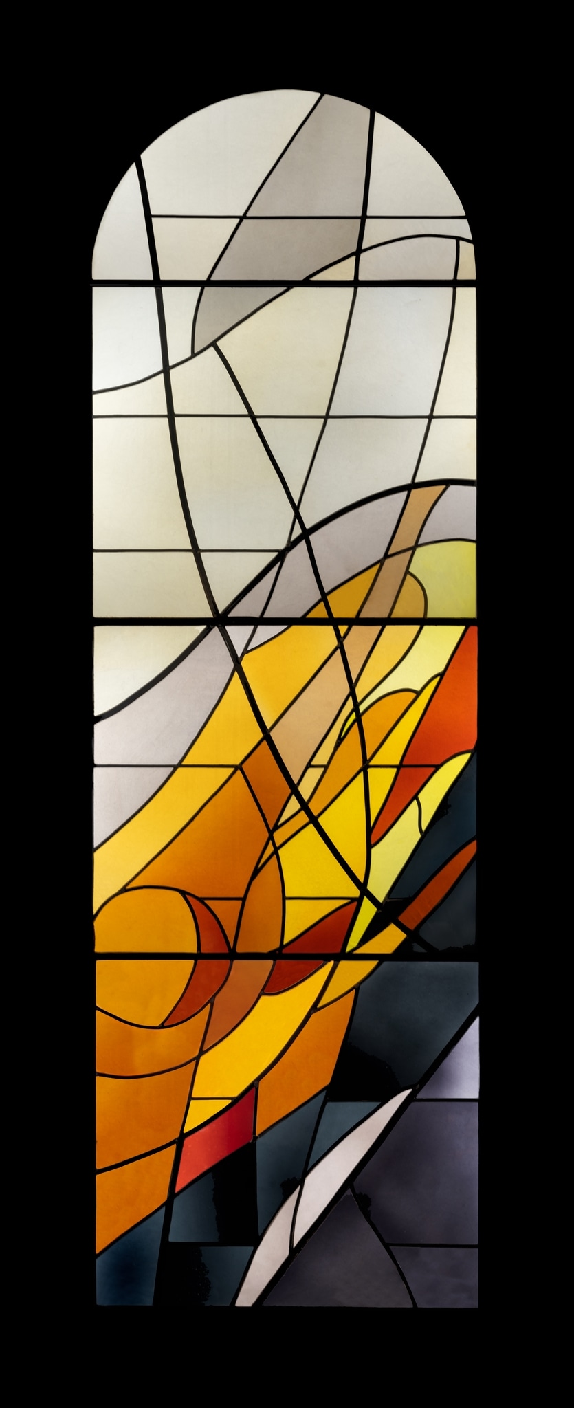 Un large faisceau de lumière aux teintes jaunes, orange, ocre, rouges et grises s’élève en diagonale depuis le bas du vitrail vers la droite. Au-dessous, par contraste, se déploie une palette de tons gris alors qu’au-dessus des nuances de gris et de jaunes très pâles s’élèvent jusqu’au sommet du vitrail. Une courbe en plomb plus large s’érige vers le haut du vitrail depuis le bas du second panneau à droite, contrecarrée par une seconde courbe suivant les lignes de la lumière du soleil.