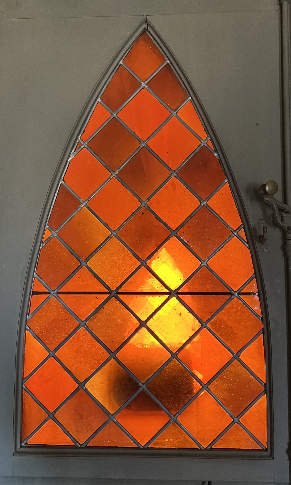 Cette petite baie en arc brisé est composée d’un vitrail à losanges colorés de différentes nuances d’orange et d’ocre élaboré avec des verres à l’antique.