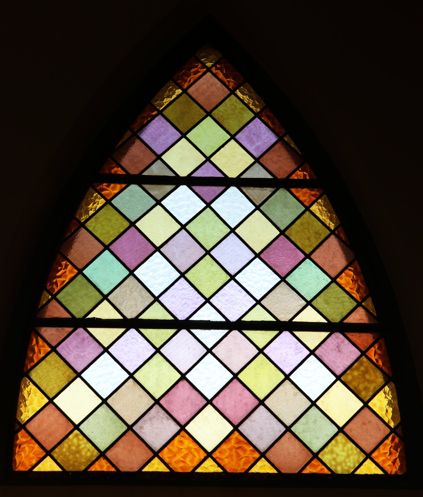 Cette baie en arc en tiers-point est composée d’un vitrail à losanges colorés de différentes nuances de teintes (jaune, or, blanc, mauve, rose et vert) élaboré avec des verres de différentes textures.