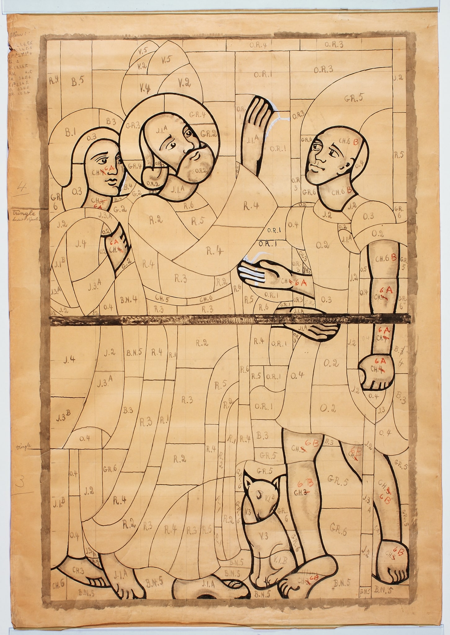 Ce carton en noir et blanc à l’échelle 1:1 est le projet définitif pour la troisième scène depuis le haut du huitième vitrail à gauche de la nef de l’église Saint-Pierre de Fribourg, consacré à saint Pierre. Elle est tirée des Actes des Apôtres (3:1-11). Les seize vitraux de la nef sont l’oeuvre de l’artiste Jean-Edouard de Castella et de l’atelier fribourgeois A. Kirsch & Cie (Arnaud et Pajor, 2008, p. 54-62).