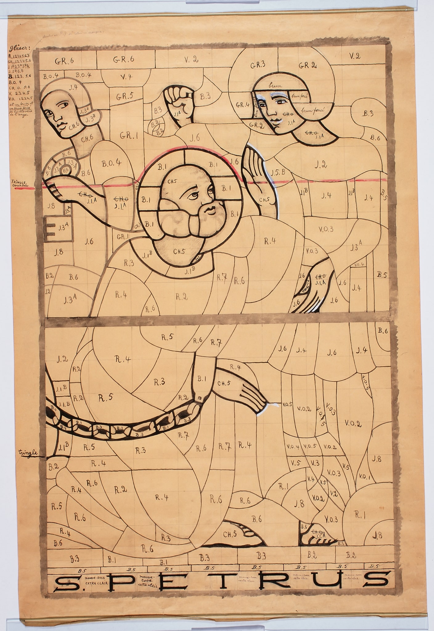 La paroisse de Saint-Pierre possède dans ses archives les maquettes de ces premières verrières. Ces projets, à l’exception de rares scènes, s’apparentent à des dessins définitifs, puisqu’ils n’ont fait l’objet d’aucune modification en ce qui concerne les couleurs, le dessin et le futur réseau de plomb, qui sont identiques au vitrail, comme le démontrent les deux dessins pour la fenêtre consacrée à Pierre, illustrant son reniement et sa délivrance. Le Vitromusée Romont conserve également une maquette (VMR_1029) pour la scène de la délivrance de saint Pierre. Celle-ci présente un premier dessin abouti intéressant, puisqu’à l’origine, Castella avait inversé l’ensemble de la scène, le saint se trouvant à droite plutôt qu’à gauche. L’ensemble de la verrière de Pierre est financé par la famille Conus (Arnaud et Pajor, 2008, p. 56), dont les armoiries sont représentées en bas à droite du vitrail, mais ne figurent pas sur ce carton.