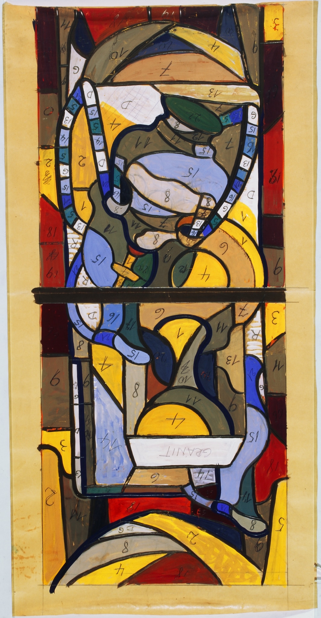 La comparaison du carton avec le vitrail indique que Jordan a déjà mentionné sur le dessin définitif quels types de verres il souhaitait utiliser pour certaines pièces, en ajoutant sur certaines couleurs différents motifs. Il indique également en toute lettre qu’il voudrait un verre dont la texture imite l’effet du granit au-dessus du calice.