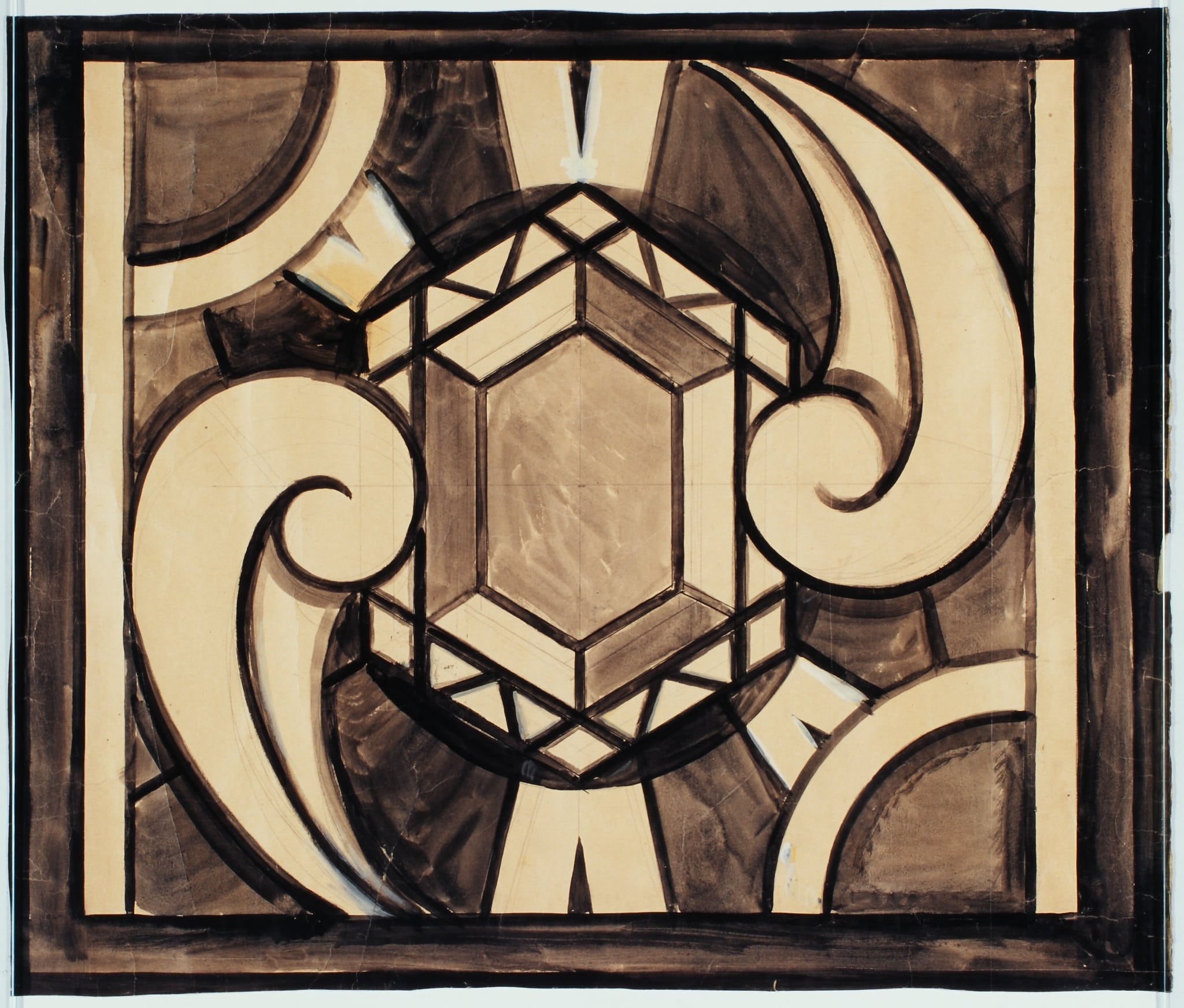 Ce carton figure la partie intérieure d’un des bras de la croix ornant la rose occidentale. Il représente une gemme hexagonale d’où partent quatre double rayons et deux volutes. Dans deux coins opposés du dessin, un quart de cercle est esquissé.