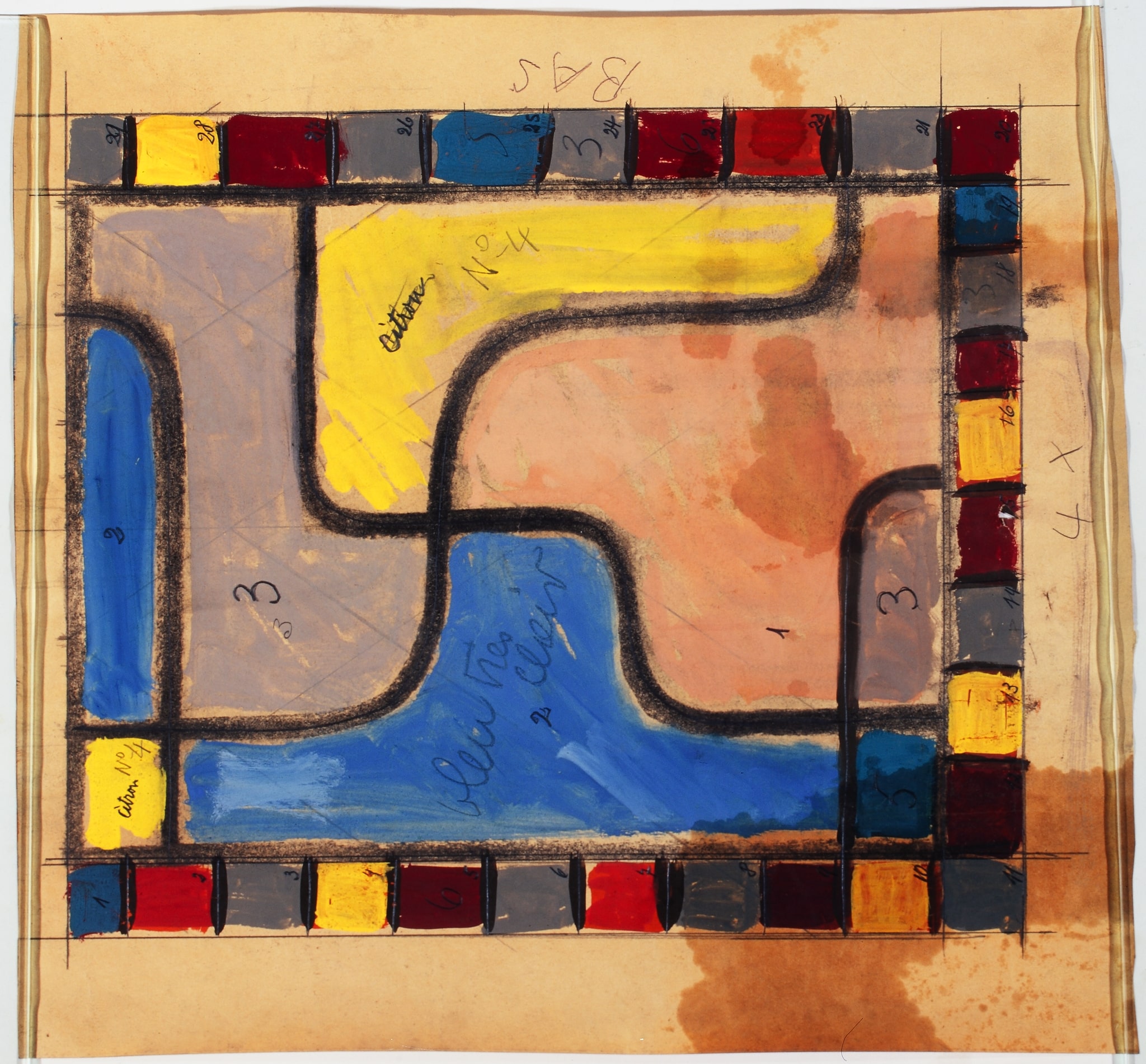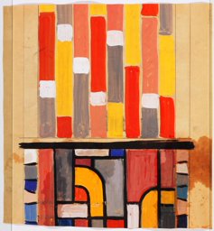Ce carton recto-verso comporte sur son recto la partie inférieure des motifs géométriques réalisés pour quatre des sept baies de la paroi verrière de la sacristie de l’église Saints-Pierre-et-Paul d’Orsonnens, construction emblématique de l’architecte du Groupe de Saint-Luc Fernand Dumas, en 1935-1936 (Lauper, 2012, p. 209). Bien que ce carton et le vitrail ne soient pas signés, nous pouvons également les attribuer à l’artiste fribourgeois Willy Jordan, auteur des verrières du choeur (Jordan, 1958, p. 2, 5). Les sept vitraux de la sacristie ont été réalisés en collaboration avec l’atelier Kirsch et Fleckner entre 1936 et 1939, les sources issues des archives de la paroisse ne nous donnant malheureusement pas d’indications plus précises à ce sujet.