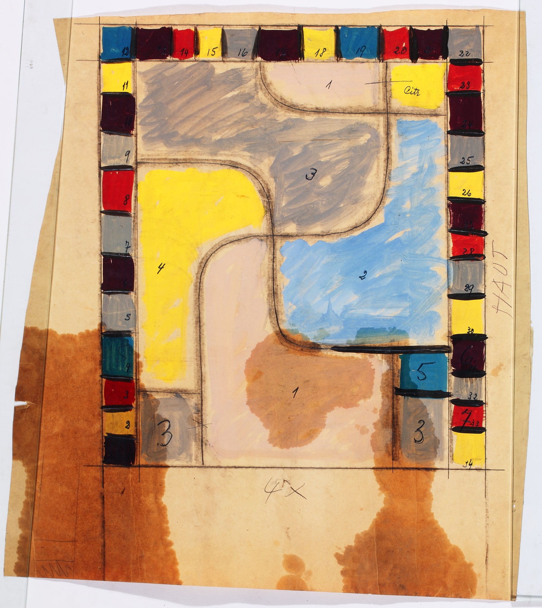 Ce carton correspond à la partie supérieure des motifs géométriques réalisés pour quatre des sept baies de la paroi verrière de la sacristie de l’église Saints-Pierre-et-Paul d’Orsonnens, construction emblématique de l’architecte du Groupe de Saint-Luc Fernand Dumas, en 1935-1936 (Lauper, 2012, p. 209). Le dessin du recto n’a pu être identifié. Bien que ce carton et le vitrail ne soient pas signés, nous pouvons tous deux les attribuer à l’artiste fribourgeois Willy Jordan, auteur des verrières du choeur (Jordan, 1958, p. 2, 5). Les sept vitraux de la sacristie ont été réalisés en collaboration avec l’atelier Kirsch et Fleckner entre 1936 et 1939, les sources issues des archives de la paroisse ne nous donnant malheureusement pas d’indications plus précises à ce sujet.
