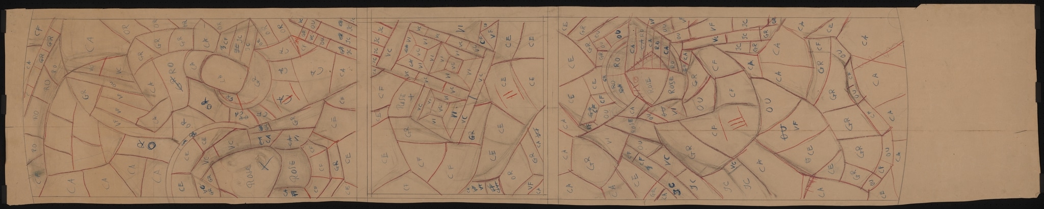 Il existe dans le fonds graphique de l’atelier Kirsch et Fleckner, propriété du Vitrocentre Romont, trois cartons pour ce vitrail (KF_909, KF_910 et KF_1060). L’artiste les a réalisés en noir et blanc et a mentionné un code couleur pour chaque pièce de verre. La comparaison du vitrail avec ces cartons indique qu’aucune modification n’a été effectuée.