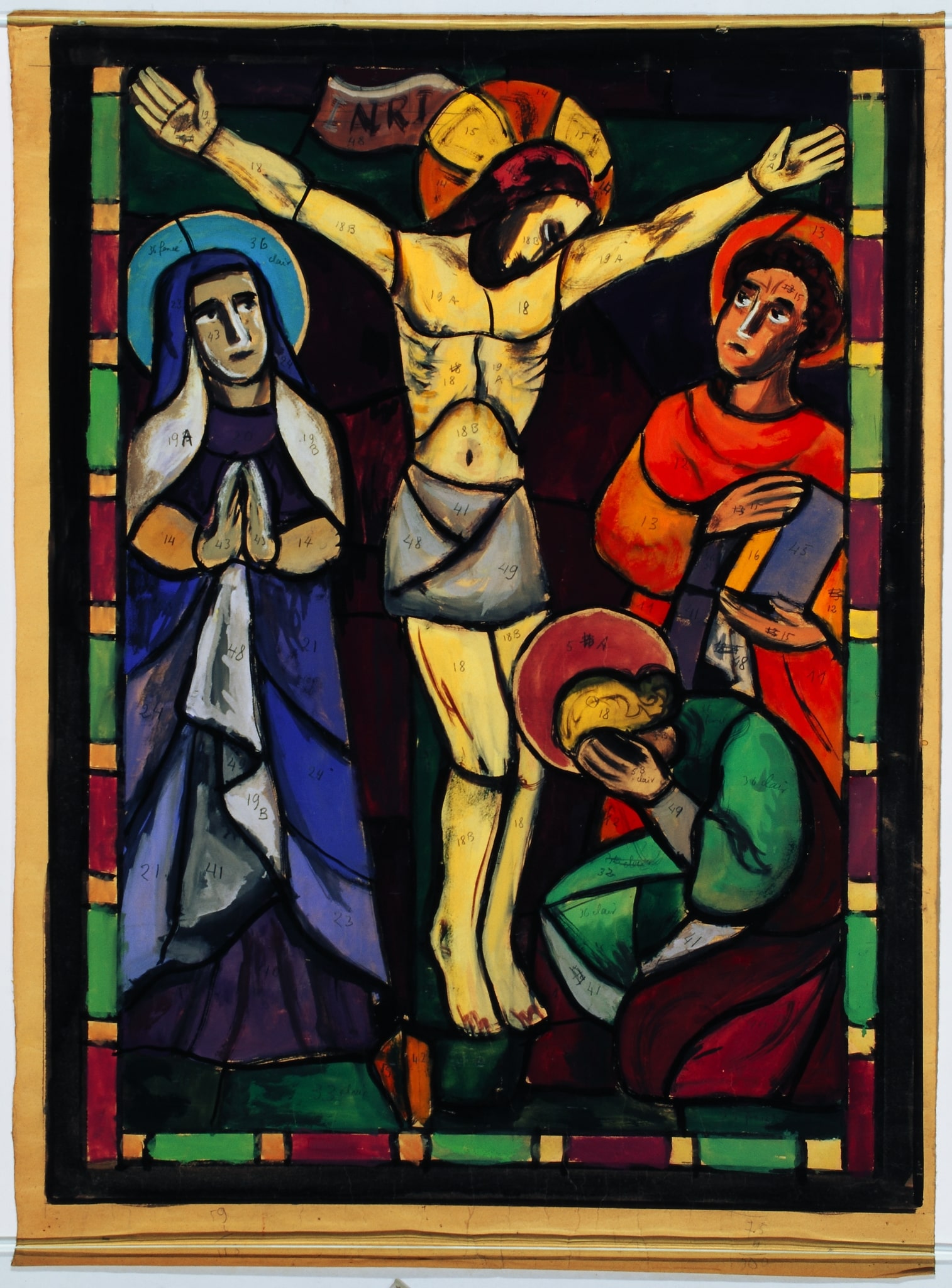 Ce carton en couleur est un travail préparatoire pour la partie inférieure d’un vitrail du choeur de la chapelle Saint-Hubert de Prévondavaux (FR), daté de 1941. Il est l’oeuvre de l’artiste fribourgeois Gaston Thévoz qui collabore pour la réalisation des verrières avec l’atelier A. Kirsch & Cie de Fribourg.