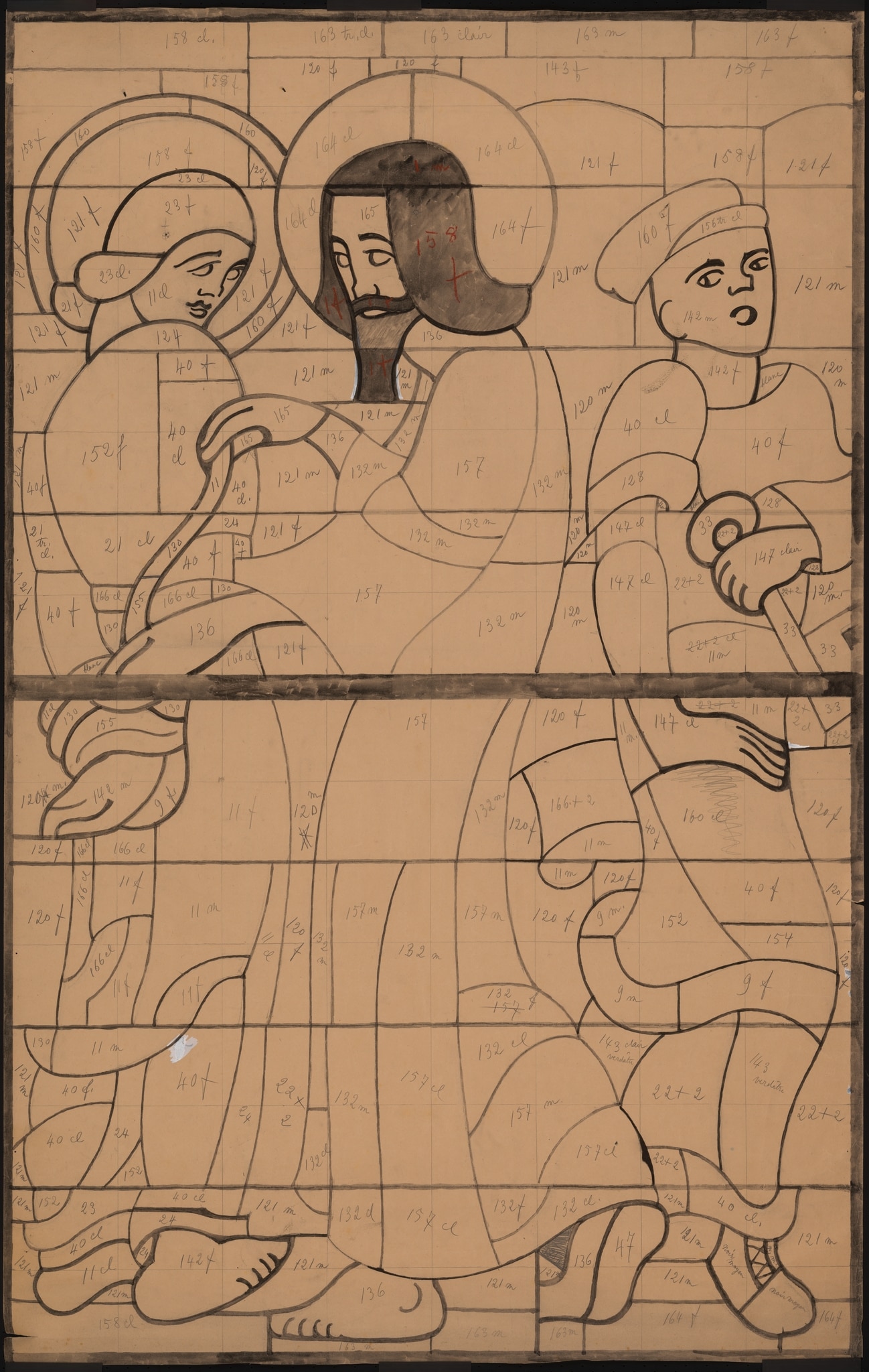 Ce carton illustrant la délivrance de Matthias par le Christ est en noir et blanc, comme les trois autres projets définitifs liés à cette verrière (KF_1142 ; KF_1150 et KF_1149). Castella a apporté des nuances de gris uniquement sur la chevelure et la barbe du Christ. Il a indiqué les codes couleur pour chaque pièce de verre et a ajouté des indications concernant les nuances des teintes souhaitées. La maquette de cette verrière devait certainement être en couleur, mais nous ne savons pas si elle existe encore.