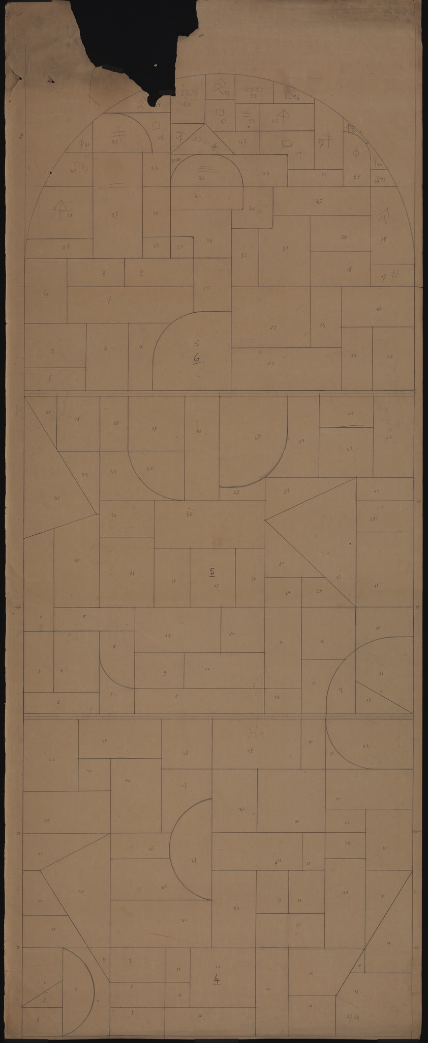Carton présentant les trois panneaux supérieurs d’un vitrail dans lesquels sont dessinées diverses formes géométriques. Chaque pièce de verre est numérotée de 1 à x. La numérotation recommence pour chaque panneau. A côté de certains numéros figure un code particulier qui semble indiquer la couleur choisie par l’artiste.