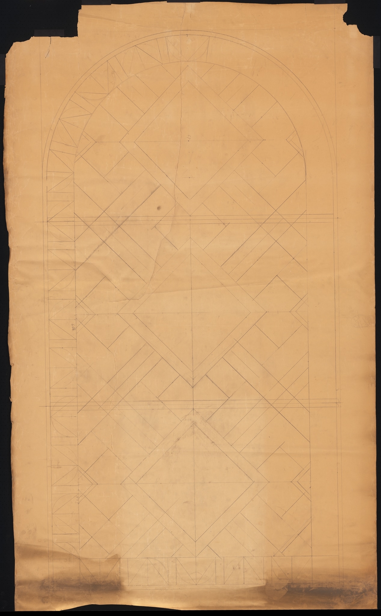 Ce dessin est représentatif du travail de préparation accompli au sein de l’atelier, soit par l’artiste Thévoz lui-même, soit par les employés de l’atelier. Il n’y figure que la composition géométrique, sans les dessins des losanges centraux imaginés par Thévoz que l’on voit sur les vitraux. Les motifs de la bordure ne sont dessinés que d’un seul côté afin de gagner du temps de travail, puisque ceux-ci se répètent de manière symétrique à droite.