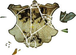 Ce panneau héraldique a été accidentellement brisé en 1976. Les fragments, au nombre de 59, ont été presque intégralement conservés. Malgré les lacunes qu’il présente aujourd’hui, principalement au niveau de l’écu central, il est possible d’affirmer qu’il était à l’origine orné des armes de la famille noble de Lucy, issue de Lorraine en France, dont le nom figure dans le cartouche.