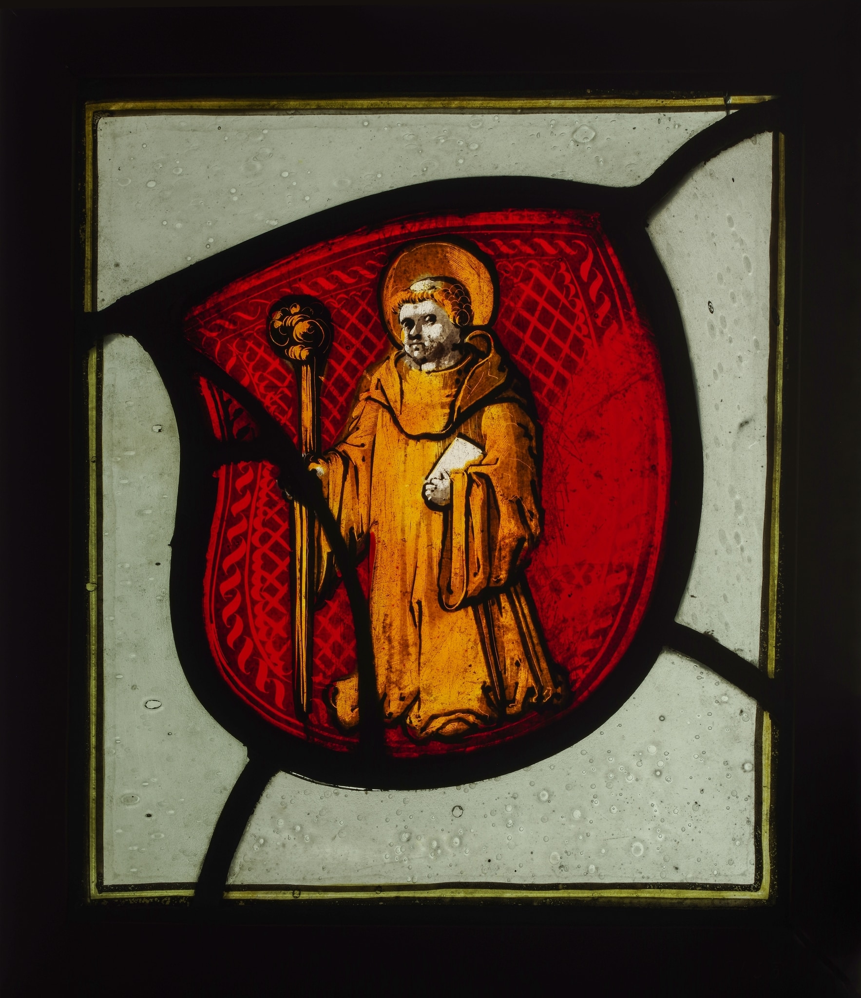 Fragment de vitrail aux armes de Glaris, représentant sur un verre en forme d’écu un moine nimbé tenant dans sa main gauche un livre et dans l’autre une crosse.