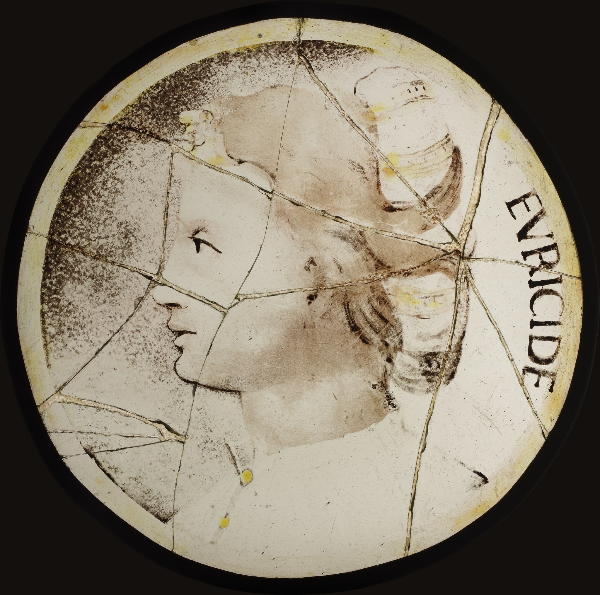 Quoique de facture et de style différents, six portraits en buste d’hommes et de femmes peints à la grisaille et au jaune d’argent sur des médaillons monolithes de petit format possèdent des similitudes avec le présent médaillon. Attribuée au peintre verrier zurichois Carl von Egeri (1510/1515-1562) connu pour avoir réalisé une autre série de bustes à l’antique, la série est aujourd’hui insérée dans le remplage d’une fenêtre de l’aile ouest du cloître du monastère de Muri (Hasler, 2002, p. 178-179, West VI). Tous portent des costumes de théâtre de la Renaissance, inspirés de la Rome antique (Hasler, 2002, 178). Selon Hasler (2002, p. 178, fig. 40), ces médaillons ont à l’origine été conçus par paire, afin de former des couples, disposés de manière à se regarder l’un l’autre. Dès lors, comme l’a suggéré Lapaire (2008, p. 29), il est tout à fait possible que ce médaillon ait à l’origine eu un pendant représentant Orphée.
