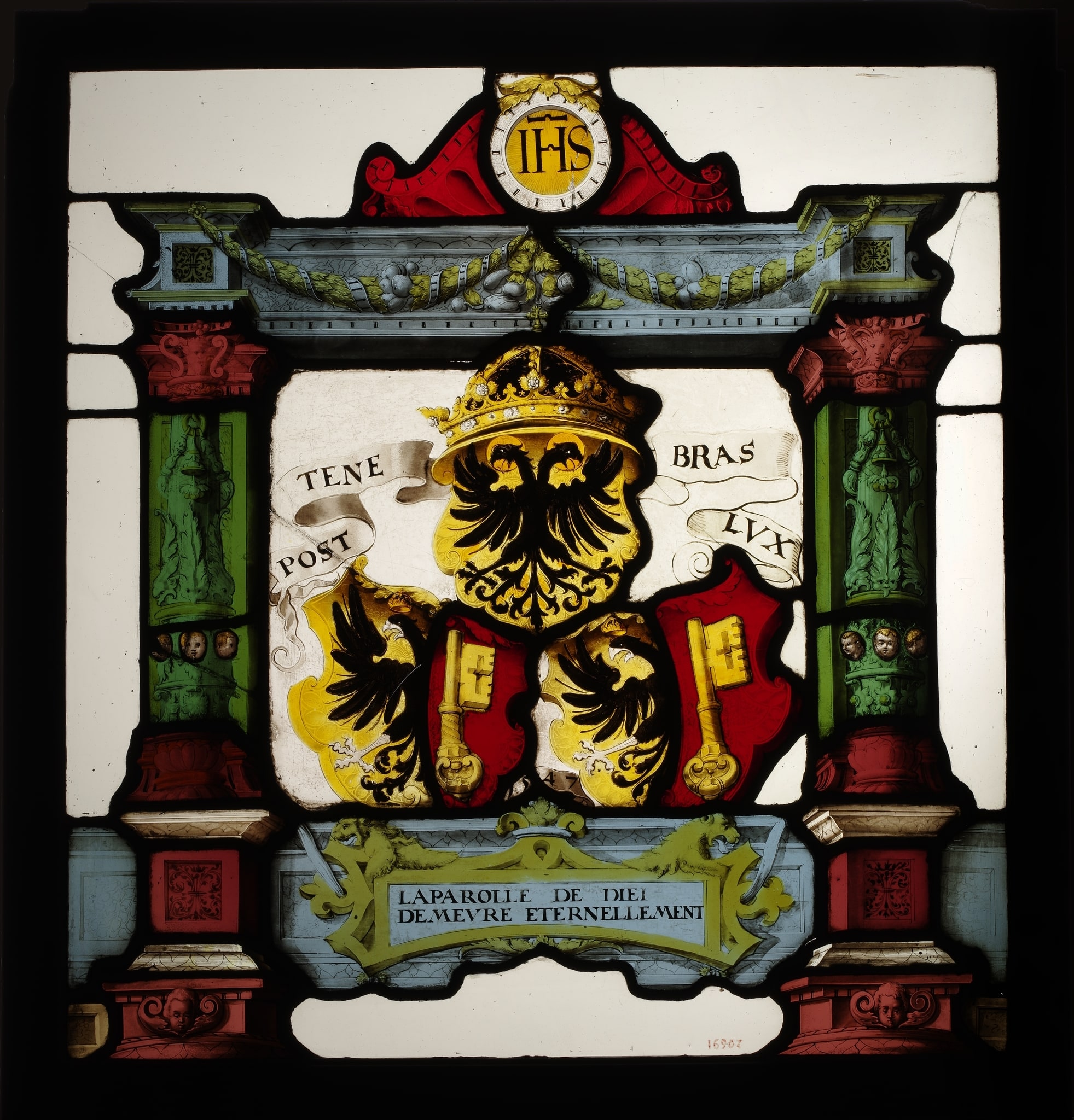 Vitrail fragmentaire représentant en son centre, arrangés en pyramide, deux écussons aux armes de Genève surmontés d’un écu aux armes du Saint-Empire couronné, avec de part et d’autre une banderole portant la devise de Genève. La composition s’inscrit dans un cadre architectural composé de piliers ornés de motifs végétaux et de têtes de putti, soutenant un entablement à frise ornée de fines arabesques et de guirlandes de feuilles et de fruits. Au-dessus de l’entablement figure un cercle encadrant le monogramme du Christ surmonté d’un symbole en forme d’omega. Dans la partie inférieure figure un cartouche comportant une inscription biblique.