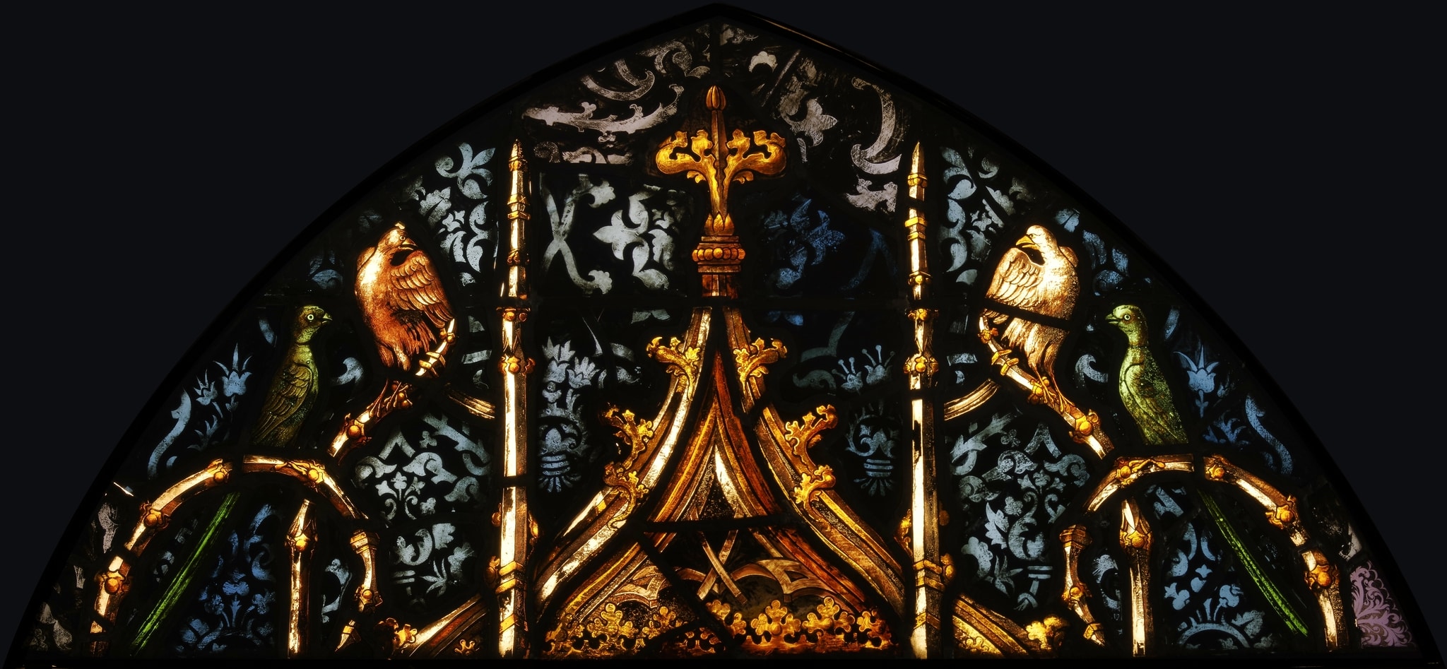 Fragment de vitrail en arc brisé représentant sur un fond damassé bleu le sommet d’un dais à l’architecture flamboyante, dont les pinacles évoquent des branches qui servent de perchoir à des perroquets et des oiseaux de proie.