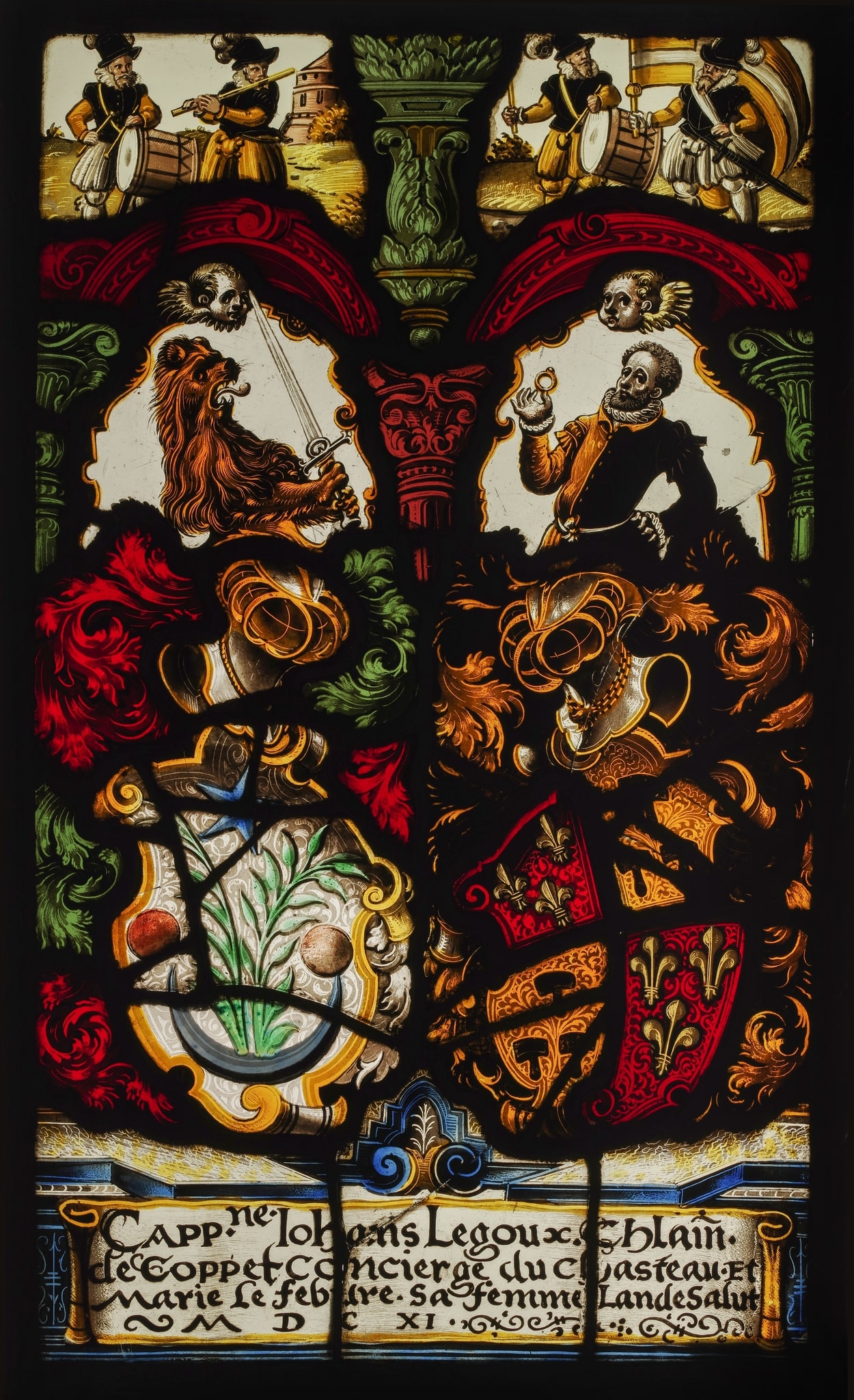 Ce vitrail d’alliance a été donné en 1611 par le couple Jean Legoux et Marie Lefèvre, comme l’indique l’inscription. Jean Legoux possédait les titres de capitaine militaire, d’intendant du château de Coppet et de châtelain administrateur de la justice sur la baronnie de Coppet. Les fonctions de châtelain et de concierge allaient souvent de paire à cette époque. Les armes permettent de le rattacher à la branche des Legoux originaire de Besançon en France, qui avait fuit à Neuchâtel pour des raisons religieuses vers 1577 (Deonna, 1953, p. 70).