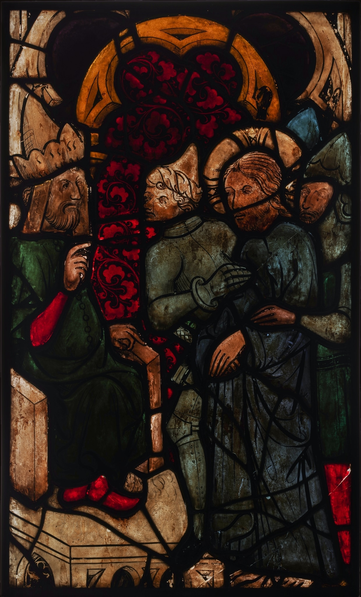 Ce vitrail va de paire avec le couronnement architectural de mêmes dimensions (GE_2055). Ils font partie d’un ensemble de quatre verrières, aujourd’hui conservées au Musée Ariana à Genève, représentant Jésus devant Caïphe (GE_2054) et le Baiser de Judas (GE_2056) surmontés de panneaux architecturaux (GE_2055 et GE_2057). A l’origine, ce cycle dédié à la Passion du Christ était probablement composé de dix vitrages insérés dans au moins deux des cinq baies du choeur de l’ancienne chapelle du château en ruine de Pottendorf, situé en Basse-Autriche (Frodl-Kraft, 1994). Seuls ces deux épisodes ont subsisté. Compte tenu de leur proximité tant narrative qu’iconographique, il est possible qu’ils aient initialement été disposés côte à côte, dans la partie haute (niveau 4 et 5) de la fenêtre gauche du choeur, jouxtant celle axiale (Wais-Wolf, Buchinger & Oberhaidacher-Herzig, 2017, p. 318).