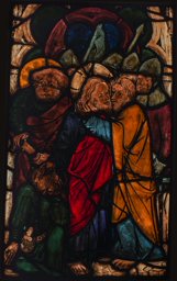 Ce vitrail va de paire avec la scène de mêmes dimensions figurant Jésus devant Caïphe (GE_2054). Ils font partie d’un ensemble de quatre verrières, aujourd’hui conservées au Musée Ariana à Genève, représentant Jésus devant Caïphe (GE_2054) et le Baiser de Judas (GE_2056) surmontés de panneaux architecturaux (GE_2055 et GE_2057). A l’origine, ce cycle dédié à la Passion du Christ était probablement composé de dix vitrages insérés dans au moins deux des cinq baies du choeur de l’ancienne chapelle du château en ruine de Pottendorf, situé en Basse-Autriche (Frodl-Kraft, 1994). Seuls ces deux épisodes ont subsisté. Compte tenu de leur proximité tant narrative qu’iconographique, il est possible qu’ils aient initialement été disposés côte à côte, dans la partie haute (niveau 4 et 5) de la fenêtre gauche du choeur, jouxtant celle axiale (Wais-Wolf, Buchinger & Oberhaidacher-Herzig, 2017, p. 318).
