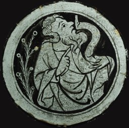Rondel représentant sur un fond noir à bordure blanche un jeune homme imberbe aux cheveux bouclés à mi-corps, habillé à l’antique et tenant de sa main gauche un phylactère sans inscription qu’il désigne de la droite. A gauche, le fond figure une branche fleurie.