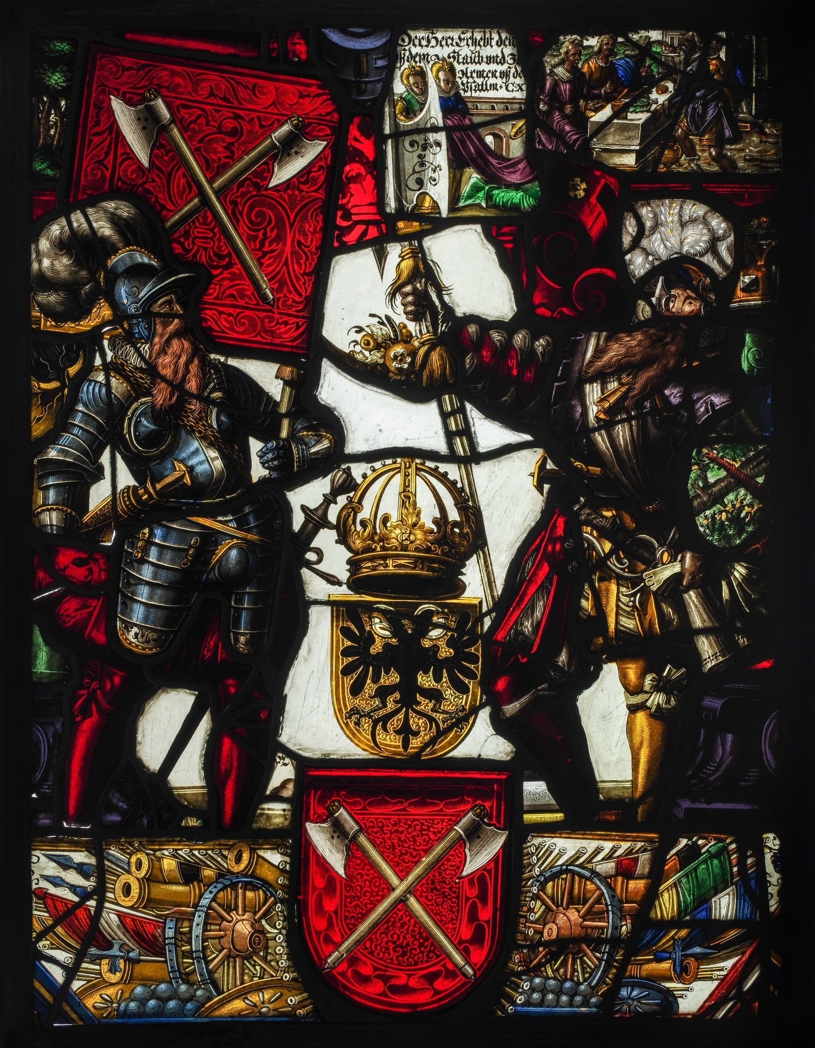 Vitrail rectangulaire composite figurant un écu aux armes de Bienne, surmonté des armes de l’Empire couronnées, accosté de deux soldats, dont celui de gauche porte une bannière et celui de droite est constitué de nombreuses pièces de remploi. La composition s’inscrit dans un cadre architectural sur un fond incolore. L’écoinçon supérieur droit figure une scène biblique accompagnée d’une légende issue d’un Psaume. Dans la partie inférieure, les armes de Bienne sont flanquées de part et d’autre de trophées d’armes (drapeaux, canons, lances, boucliers, etc.).