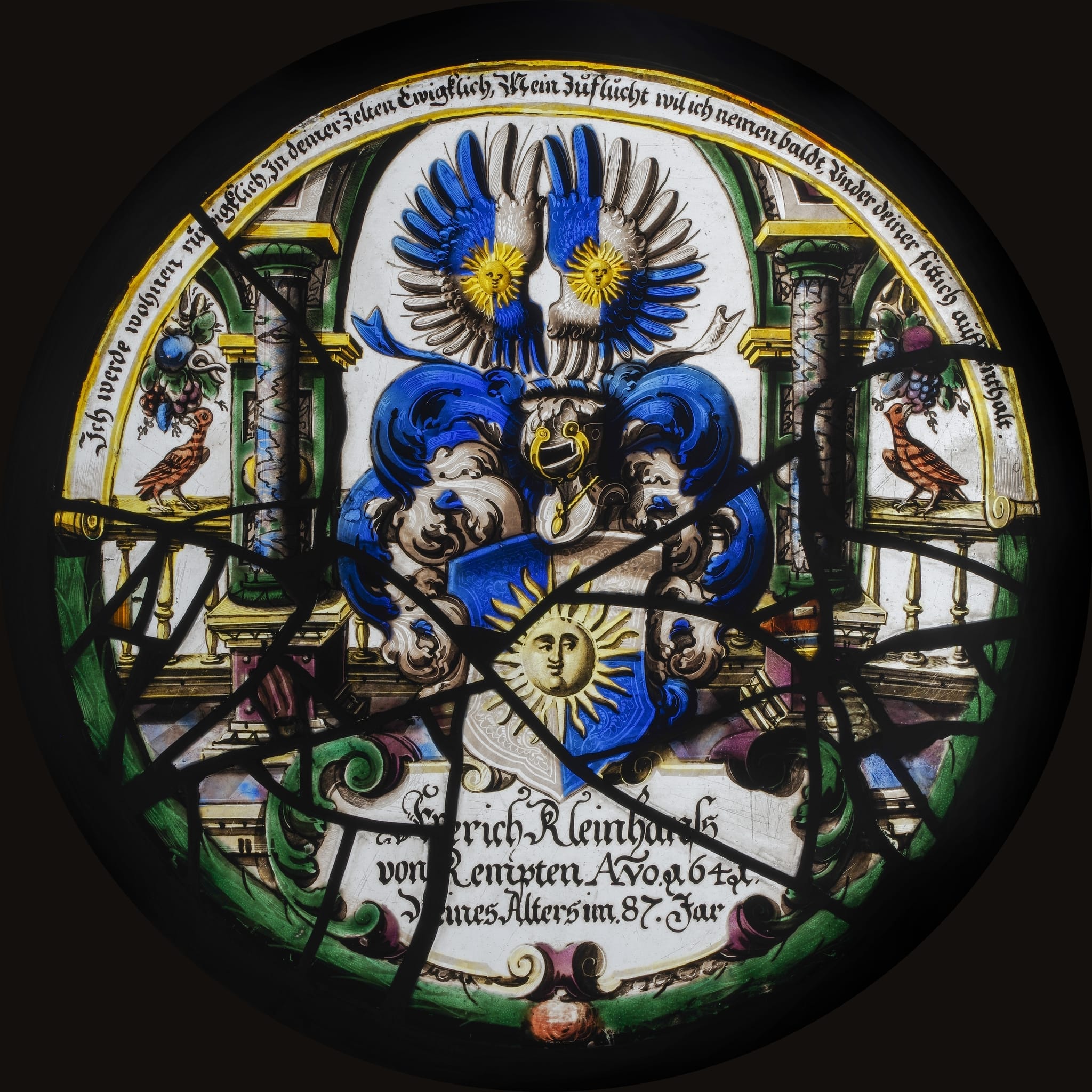 Le présent rondel a été donné en 1641 par Friedrich Kleinhans de Kempten, alors qu’il était âgé de 87 ans, comme le souligne l’inscription. La mention de l’âge du commanditaire est un élément inhabituel. A ce jour, nous ne possédons pas plus d’informations sur le donateur. La mention de Kempten pourrait correspondre à la seigneurie du même nom de Zurich (Illi, 2008) ou à la ville située dans la région d’Allgäu, dans le sud de l’Allemagne. Étant donné qu’Apollonia Zwicker († 1615), la mère de la donatrice du second panneau de l’Ariana, est issue de la famille Kleinhans de Kempten en Allemagne (HFLS), la seconde option paraît la plus plausible. Il est dès lors possible que des liens familiaux aient liés les commanditaires de ces panneaux, allant dans le sens d’une donation groupée.