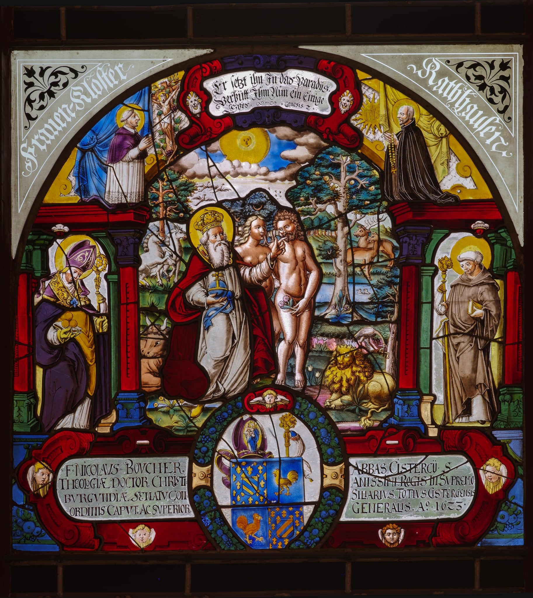 Le présent panneau a été donné en 1623 par Nicolas II Boucherat (1562-1625), alors qu’il était abbé général de Cîteaux, fonction qu’il a occupé de 1604 jusqu’à sa mort. L’inscription sur le vitrail mentionne également son titre de docteur en théologie et son statut de président des États de Bourgogne. En tant qu’abbé général de l’ordre des cisterciens, les saints personnages représentés sur les côtés ont été choisis avec soin. A gauche, saint Nicolas apparaît en pied en tant que saint patron du nom du donateur, surmonté de saint Bernard dont la réforme a été importante pour l’ordre de Cîteaux. A droite, le personnage en pied pourrait être saint Benoît (?), fondateur de l’ordre des Bénédictins. Il est peut-être surmonté de saint Ignace de Loyola (?), fondateur de l’ordre des Jésuites canonisé l’année précédant la donation de cette verrière. La présence de saint Ignace est appuyée par la présence de jésuites comme confesseurs au couvent de Rathausen (Sommer-Ramer, 2010).