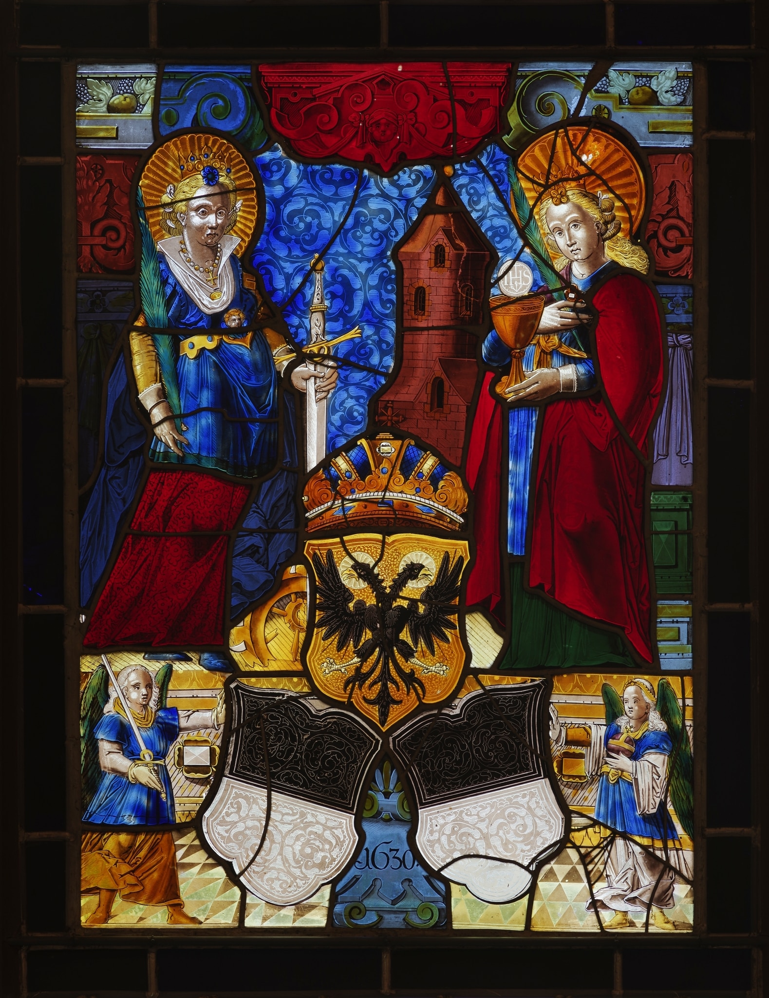 Il est rare que les saintes patronnes de Fribourg apparaissent au centre des représentations, sans être accompagnées de saint Nicolas. Le seul autre exemple connu est un vitrail armorié bernois de 1523 dont l’écu (aux armes du couvent de Königsfelden ou de l’abbesse Katharina Truchsess von Waldburg ?) est encadré par sainte Catherine et sainte Barbe dans un cadre architectural (BE_700).
