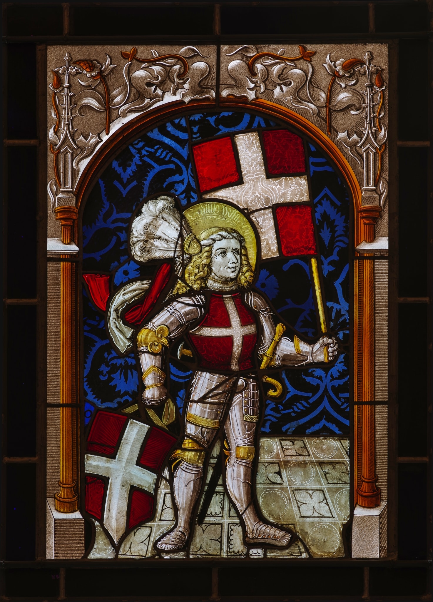 Il existe des parallèles entre le présent vitrail et ceux de Soleure figurant Saint Ours d’Ursenbach exécuté en 1518 (BE_695), de Leuzigen en 1519 (BE_413), ou encore de celui fragmentaire de l’église d’Hindelbank aujourd’hui conservé au Musée historique de Berne (BE_1437). Leurs compositions sont à quelques détails près identiques (boucles dorées tombant sur les épaules du saint, décors de l’armure, coiffe, posture du personnage, nimbe et inscription, sol carrelé, fond damassé, etc.). La réfection totale du cadre architectural du présent panneau ne permet pas de comparaison avec ceux de ces vitraux. Ces panneaux semblent eux-mêmes basés sur le panneau de 1515 de l’église de Jegenstorf (BE_799), attribué au peintre verrier bernois Jacob Meyer (actif entre 1513 et 1535). La présente verrière présente également de nombreuses ressemblances stylistiques (notamment le modelé des visages et des drapés) avec le panneau d’État de Fribourg qui figure saint Nicolas, daté de 1515 et attribué à ce même maître (BE_785). Cette comparaison permet une attribution du présent vitrail au peintre verrier Jacob Meyer.