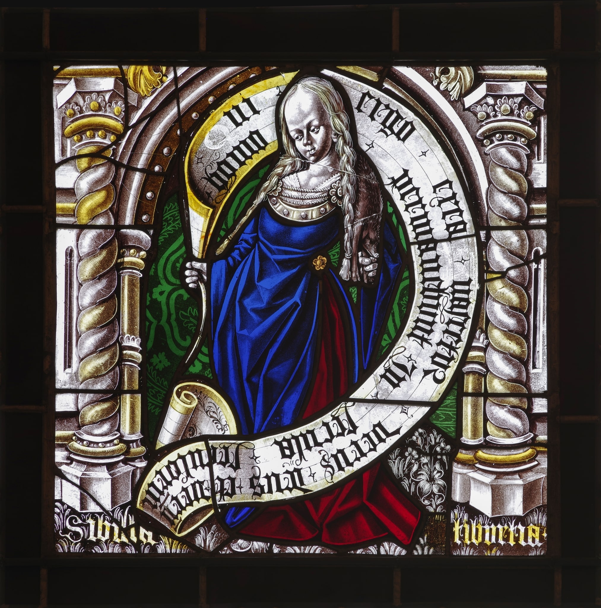 Une seconde hypothèse non négligeable concernant la localisation d’origine de la série a été apportée par Barberi (2016, p. 101) et a depuis été suivie par De Bosio (2021, p. 59-60). Cette supposition veut que les dix panneaux des Sibylles présents à l’Ariana proviennent du couloir dit des Sibylles, situé au premier étage du prieuré Santi Pietro e Orso d’Aoste, auquel il aurait donné son nom (Barberi & Boccalatte 2016, p. 101). Construite entre 1490 et 1500, cette galerie a été exécutée sous Georges de Challant et possède aujourd’hui encore trois fenêtres dont les dimensions sont compatibles avec celles des panneaux, à savoir des carreaux légèrement plus hauts dans la partie inférieure que dans la partie supérieure (Barberi & Boccalatte 2016, p. 101 ; De Bosio, 2021, p. 59). De Bosio (2021, p. 59-60) a étayé cette hypothèse en relevant la similitude du tracé des lettres et du motif de la colonne torsadée alternant blanc et jaune d’argent, qui se retrouvent par exemple dans le vitrail de la Sibylle cumaine (GE_2143) et dans les fragments de vitraux du trésor du prieuré. Chacune des baies pouvant accueillir quatre vitraux, la présence des Sibylles dans ces fenêtres élèverait le nombre de panneaux de la série à douze, comprenant peut-être les Sibylles samienne et phrygienne, aujourd’hui perdues. La présence de deux cycles de vitraux distincts au château d’Issogne et à la collégiale d’Aoste ayant pour thème les prophéties messianiques et l’Incarnation, mêlant histoire antique et christianisme, serait particulièrement intéressante et révélatrice de l’intérêt de Georges de Challant pour ces sujets si singuliers qui font rarement l’objet d’un programme décoratif à part entière (De Bosio, 2021, p. 58-59).