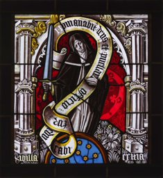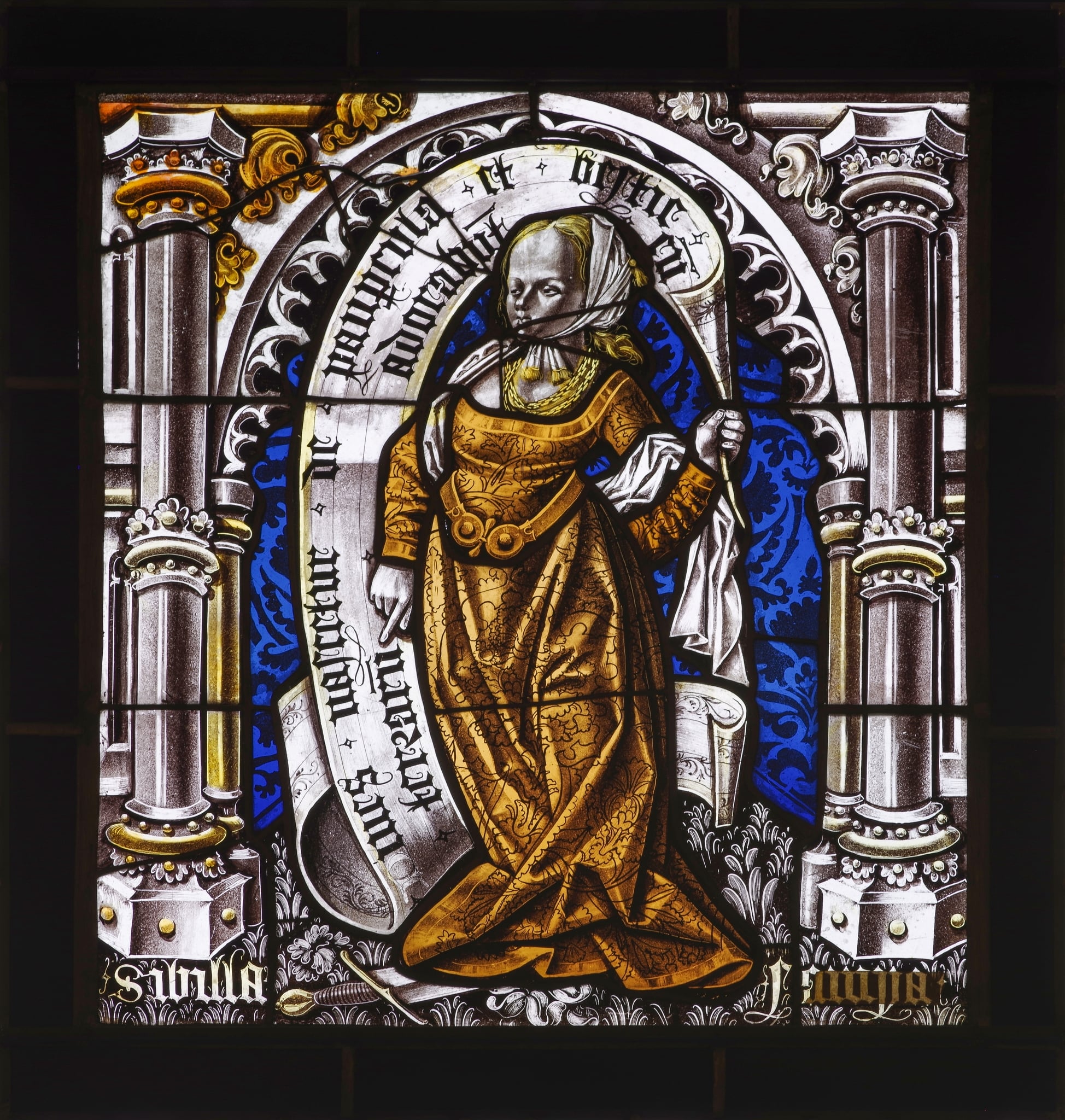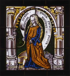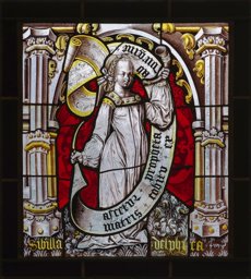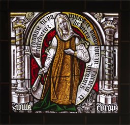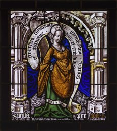 Vitrail représentant une femme debout sur une épée, vêtue d'un costume du XVIe siècle et portant un phylactère. Le personnage est placé dans un cadre architectural sous un arc brisé, sur un fond damassé et un sol tapis de végétaux.
