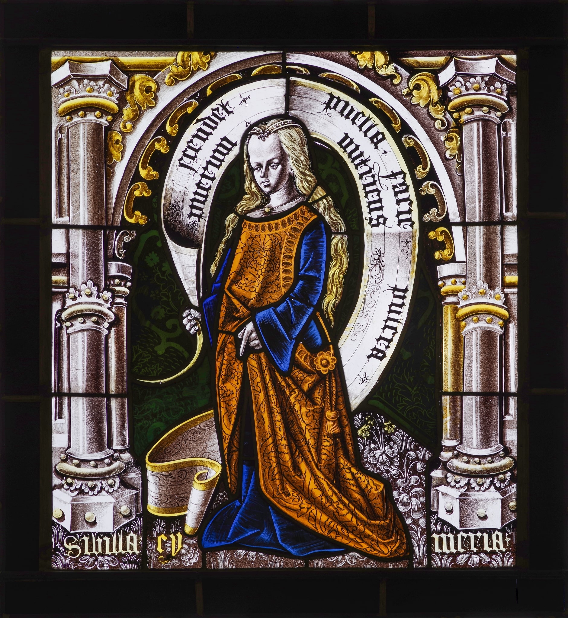 Vitrail représentant une femme en pied, vêtue d'un costume du XVIe siècle et portant un phylactère. Le personnage est placé dans un cadre architectural sous un arc brisé, sur un fond damassé et un sol tapis de végétaux.