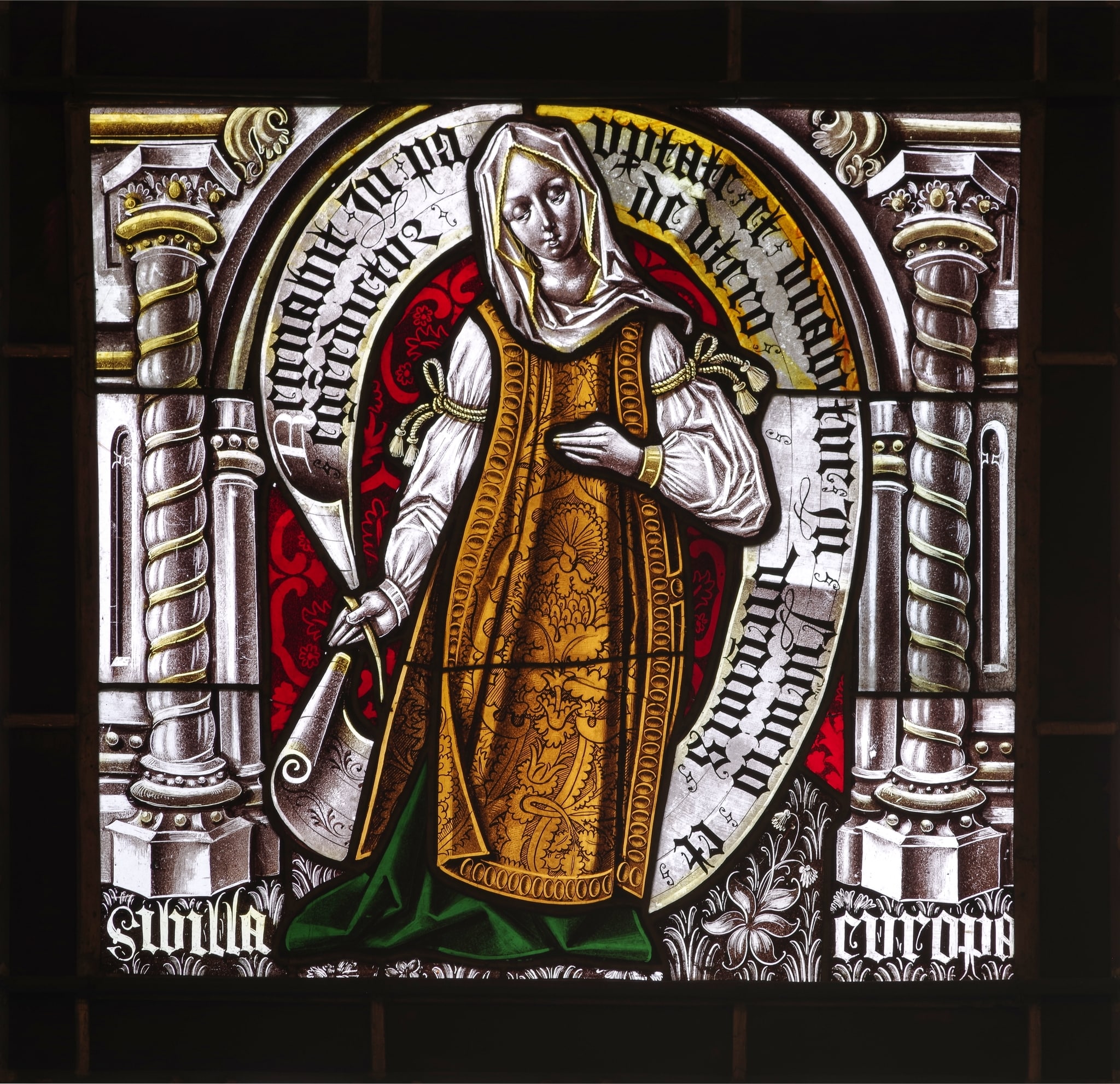 Vitrail représentant une femme en pied, vêtue d'un costume du XVIe siècle et portant un phylactère. Le personnage est placé dans un cadre architectural sous un arc brisé, sur un fond damassé et un sol tapis de végétaux.
