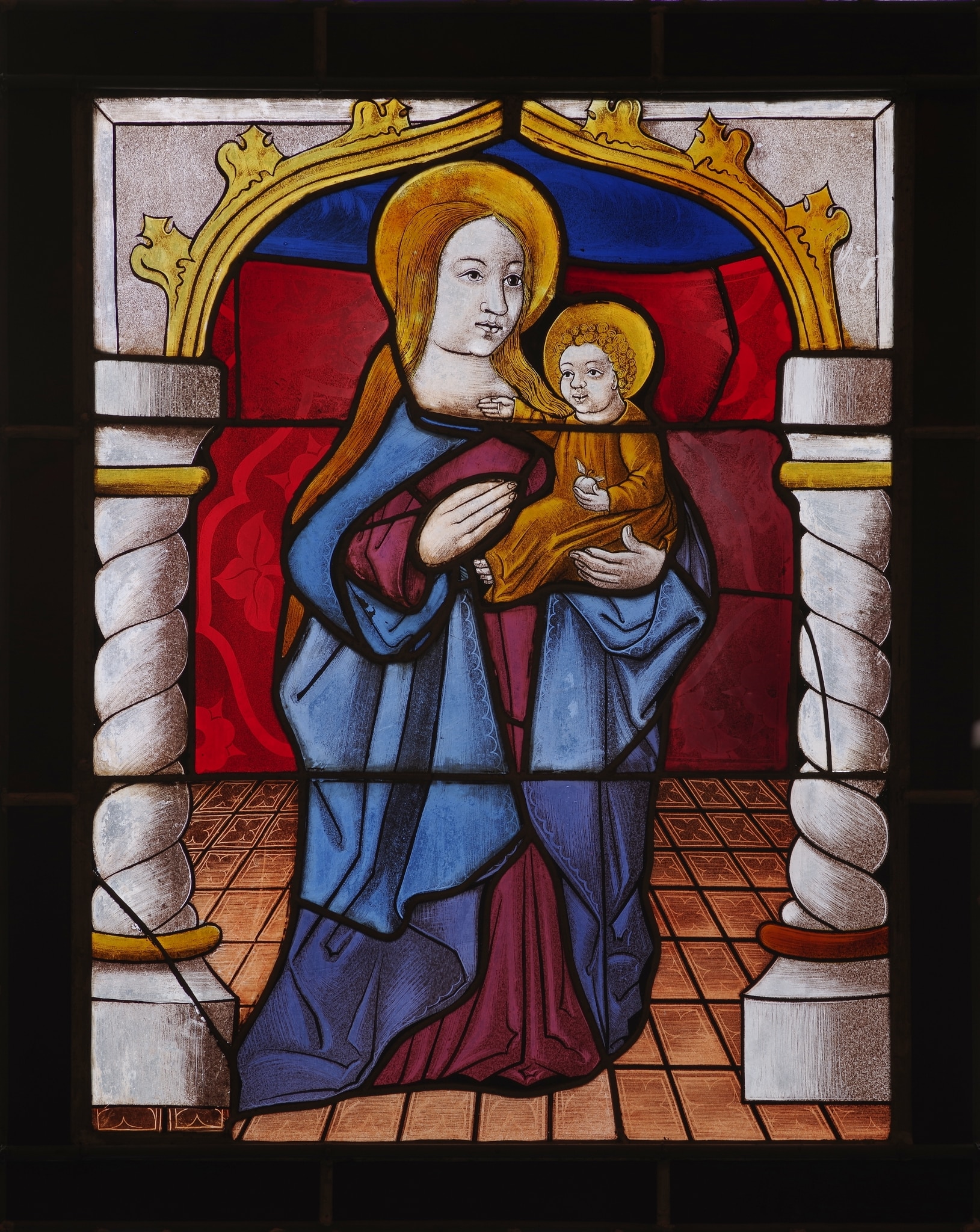 Vitrail rectangulaire représentant une Vierge à l'Enfant en pied. Elle se tient sur un sol carrelé entre deux colonnes soutenant un arc brisé, sur un fond damassé.