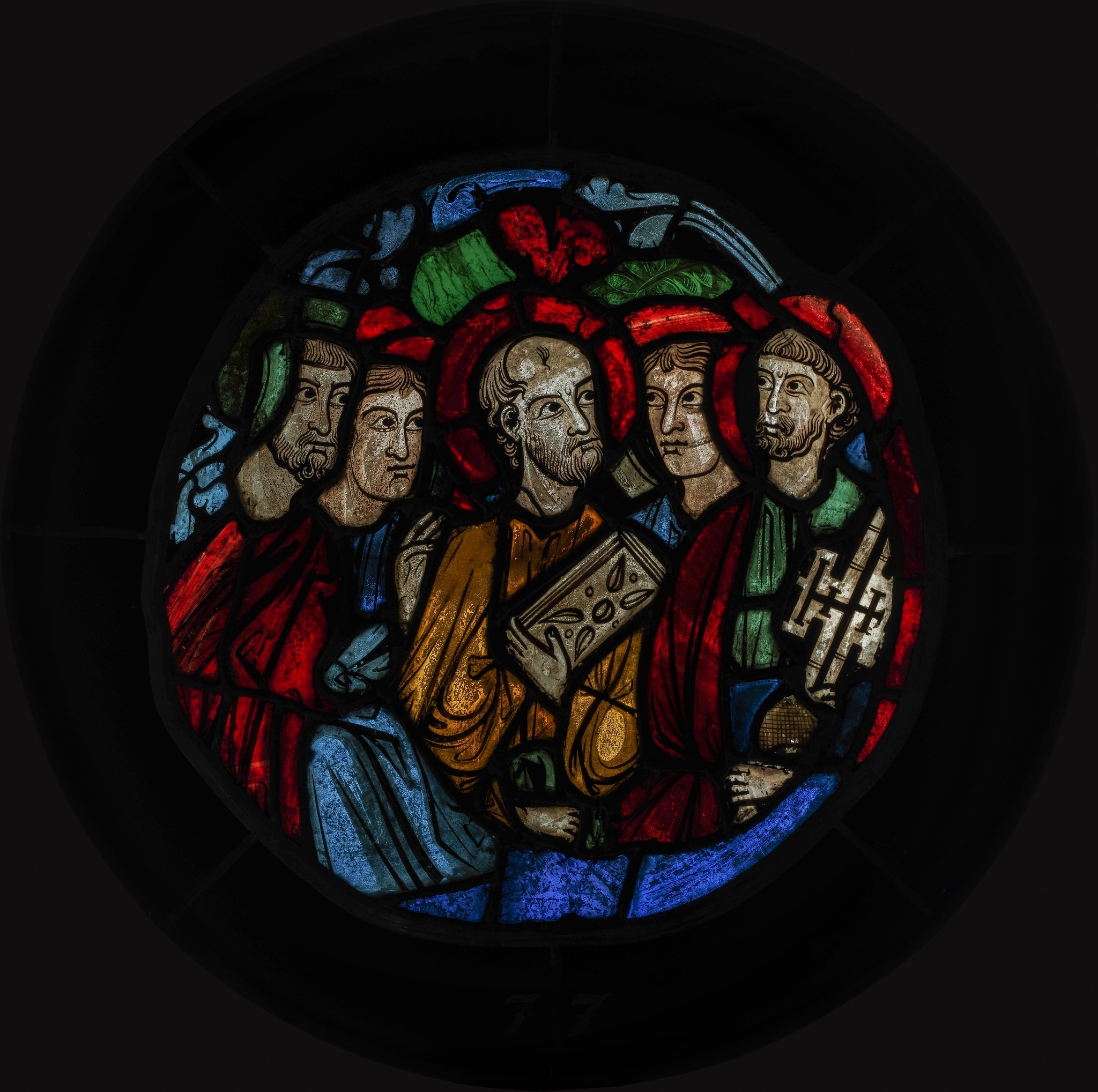 Le sujet du présent vitrail a été interprété par Sidler (1905, p. 103), puis Deonna (1938, p. 173) comme le Christ entouré de quatre apôtres. Cependant, la figure centrale peut être identifiée avec certitude comme étant saint Paul, grâce à ses attributs physiques et iconographiques. Il en va de même pour saint Pierre à droite. Le reste du médaillon est fortement remanié et comporte de nombreuses pièces de remplois disparates, si bien qu’une réserve doit être émise quant à l’appartenance originale des trois autres personnages à ce même panneau (Lafond, 1948, p. 117). Il n’est cependant pas rare de voir les deux saints affublés de leurs attributs et suivis d’apôtres. C’est notamment le cas dans les représentations du Jugement dernier, comme par exemple à la cathédrale de Bourges. Le vitrail pourrait ainsi être rattaché à ce thème christologique.