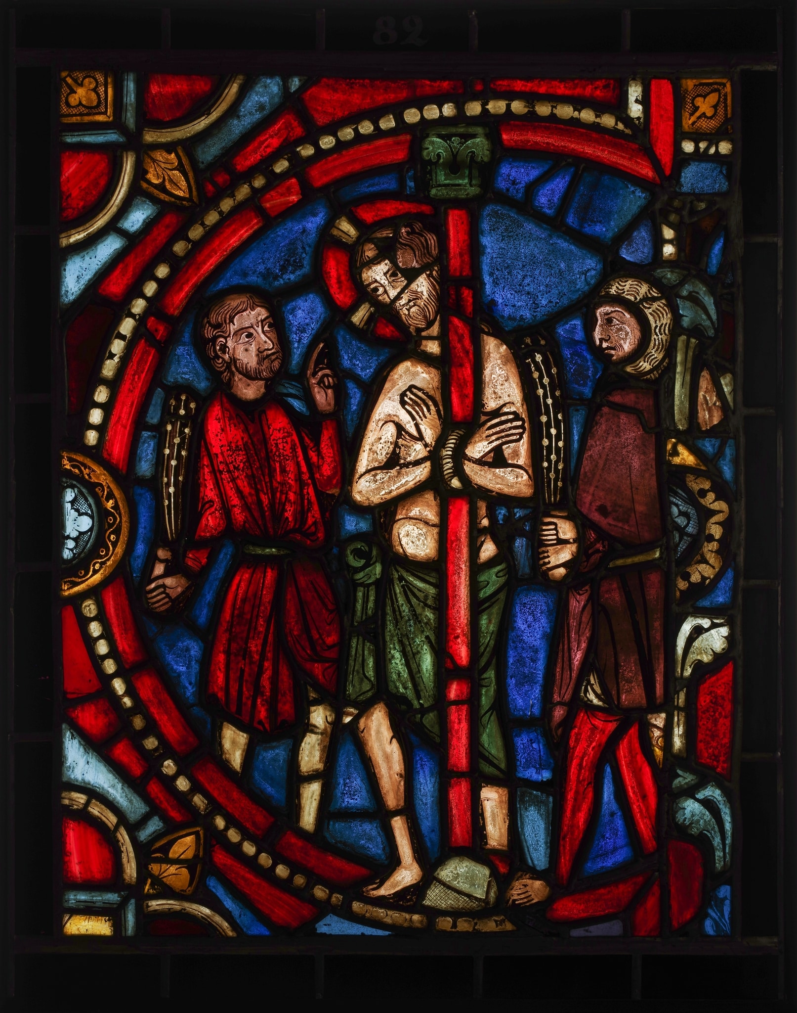 Ce vitrail fait partie d’un ensemble de vingt-trois panneaux connus à ce jour, provenant de l’église Saint-Ferréol à Saint-Fargeau, dans l’Yonne en France. Malgré l’état fragmentaire et fortement remanié du groupe, les différents épisodes illustrés peuvent être rattachés à des thèmes christologiques qui s’articulent autour de la Passion du Christ, de la Vie de la Vierge et du Jugement dernier, ou hagiographiques, essentiellement centrés sur les saints Pierre, Paul, Blaise, François et Vincent.