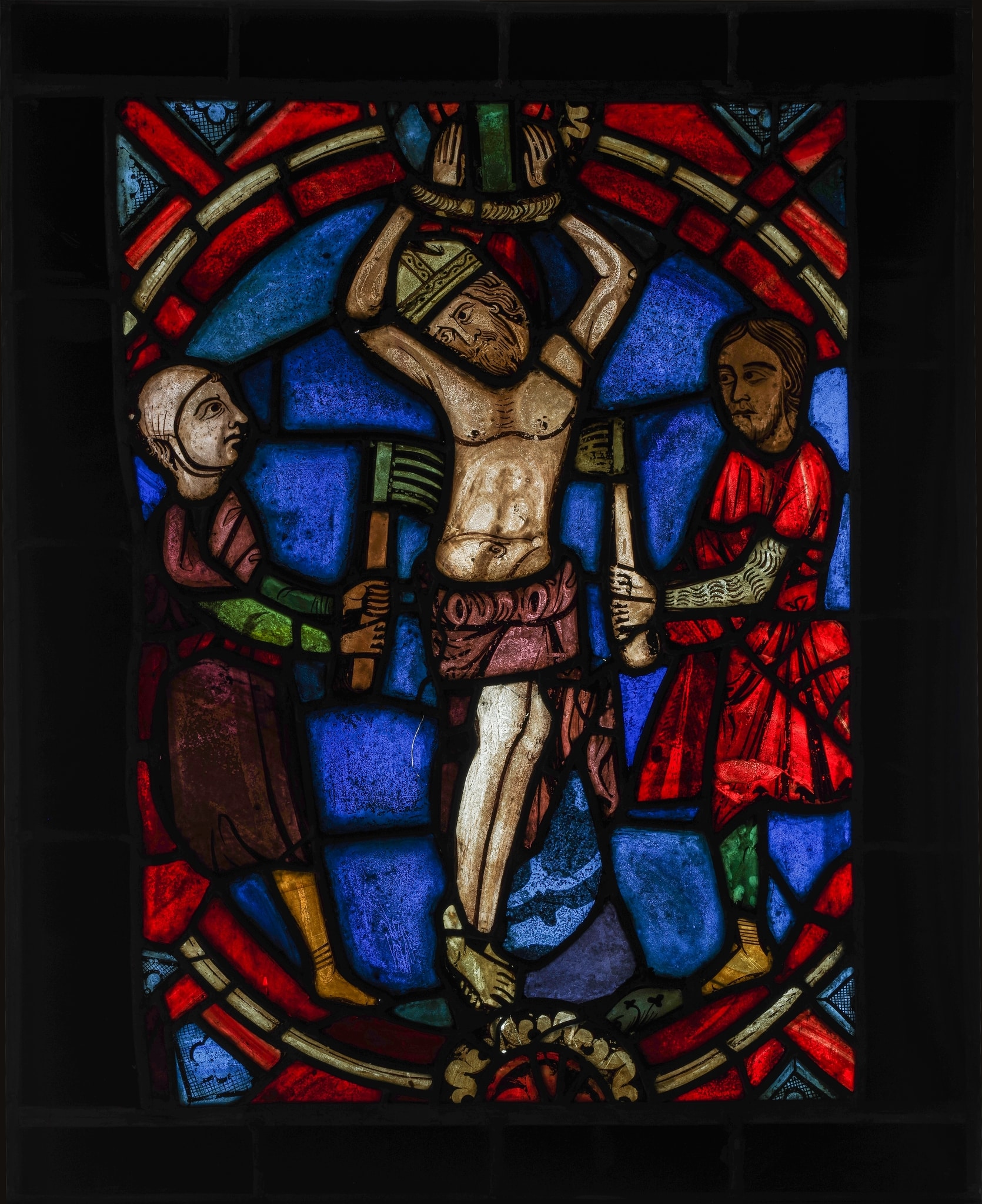 Ce vitrail fait partie d’un ensemble de vingt-trois panneaux connus à ce jour, provenant de l’église Saint-Ferréol à Saint-Fargeau, dans l’Yonne en France. Malgré l’état fragmentaire et fortement remanié du groupe, les différents épisodes illustrés peuvent être rattachés à des thèmes christologiques qui s’articulent autour de la Passion du Christ, de la Vie de la Vierge et du Jugement dernier, ou hagiographiques, essentiellement centrés sur les saints Pierre, Paul, Blaise, François et Vincent.