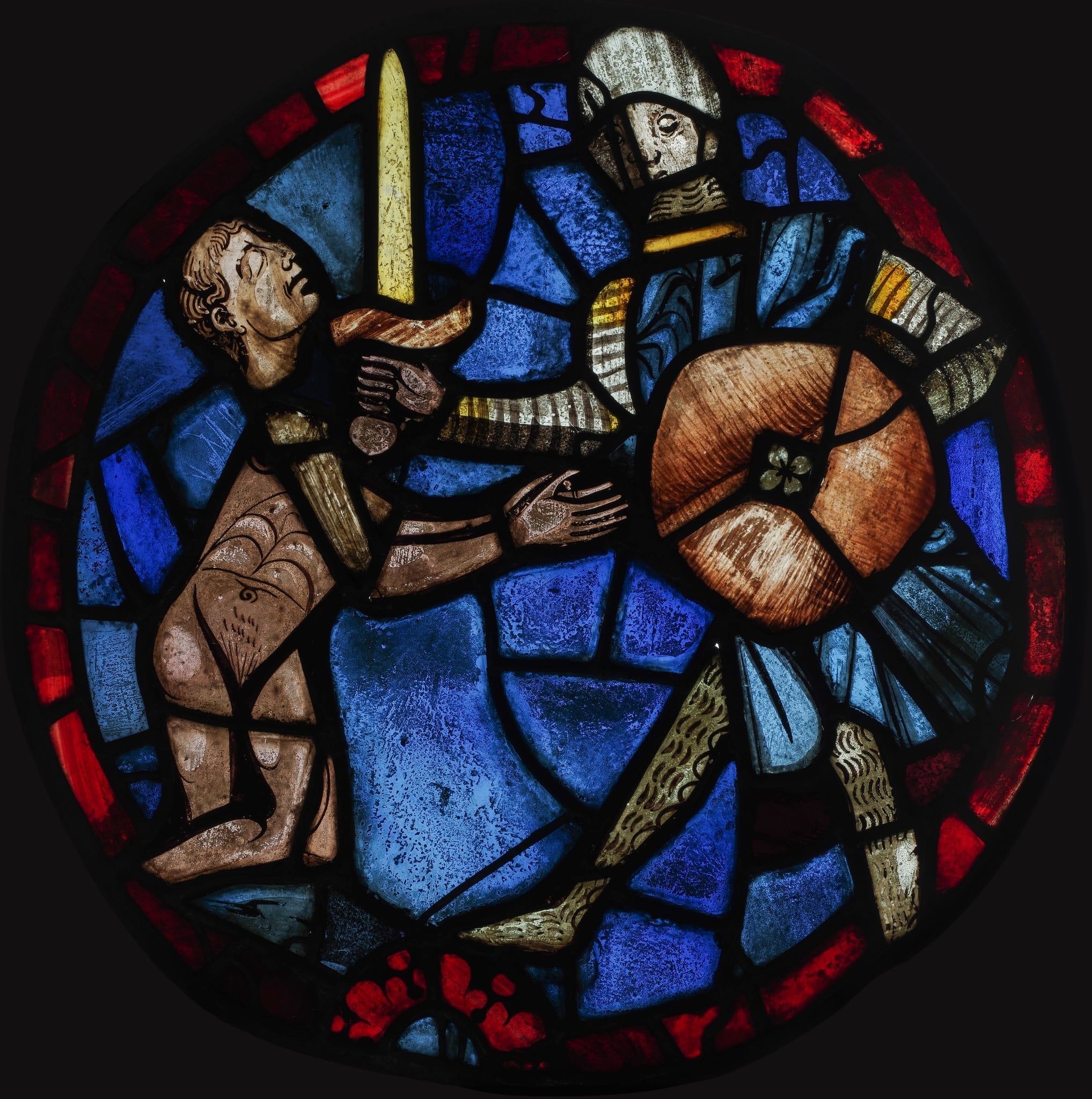 Le présent vitrail, bien qu’en partie composé d’authentiques verres de Saint-Fargeau, a été intégralement réarrangé et restauré au XIXe siècle, sans cohérence thématique avec les sujets précédemment cités. Selon Lafond (1948, p. 122), quelques fragments du XIIIe siècle le composent, à l’instar des jambes du soldat et de la tête de la victime qui pouvait à l’origine appartenir à un homme endormi. D’après Raguin (1985, p. 76), le corps dénudé de la victime pourrait provenir d’un panneau consacré à la légende de saint Vincent, tout comme le nageur (GE_2176). L’existence d’une baie dédiée à ce saint ne serait pas inhabituelle, son martyre étant également figuré dans une verrière de la cathédrale d’Auxerre et étant fréquemment associé à celui de saint Blaise, dont le supplice (GE_2171) apparaît non seulement à Saint-Fargeau, mais aussi à Saint-Ferréol (Raguin, 1985, p. 75).