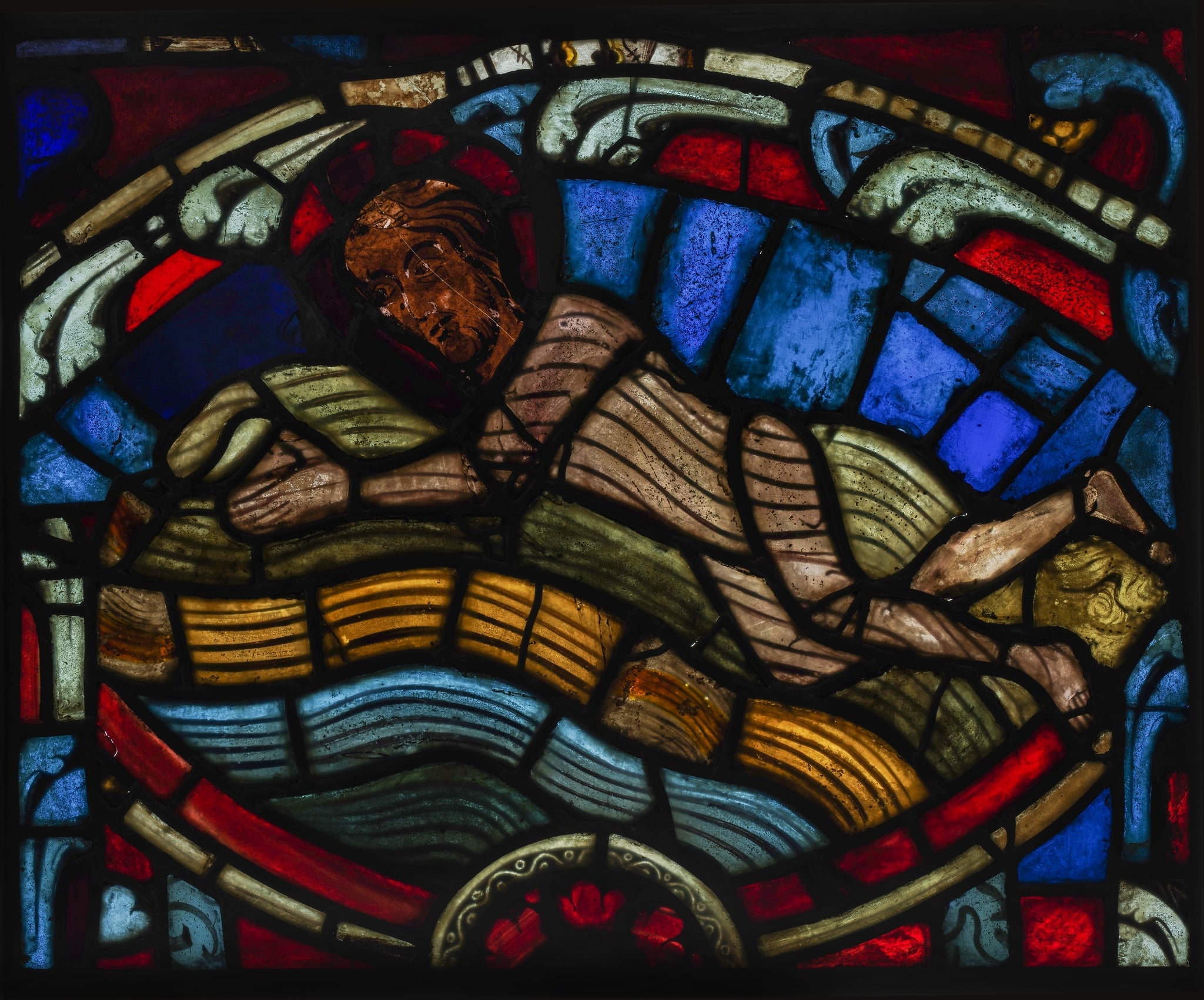 Le personnage représenté sur ce vitrail a tour à tour été identifié par Sidler (1905, p. 103) comme saint Jonas, puis par Deonna (1938, p. 174) comme saint Pierre et enfin par Lafond (1948, p. 122-123) comme saint Vincent. Quoique la scène ne corresponde pas pleinement à l’iconographie habituelle du martyre de Vincent, telle qu’on peut la retrouver à Bourges ou à Tours et qui montre le saint une pierre attachée au cou (Lafond, 1948, p. 123), cette hypothèse a été suivie par Raguin en 1985 et demeure à ce jour la plus crédible. Elle est appuyée par l’existence à la cathédrale d’Auxerre d’une verrière dédiée à son martyre et au fait qu’il est fréquemment associé à celui de saint Blaise, dont le supplice (GE_2171) apparaît à Saint-Ferréol (Raguin, 1985, p. 75). D’après Raguin (1985, p. 76), le corps dénudé de la victime qui apparaît sur un médaillon composite (GE_2174) pourrait lui aussi être issu d’un épisode de la légende de saint Vincent. La bordure composée de pièces de remplois laisse entrevoir divers fragments de fonds issus entre autres des baies de la Vie de la Vierge (palmettes) et de Pierre et Paul (palmette à baies et fermaillets).
