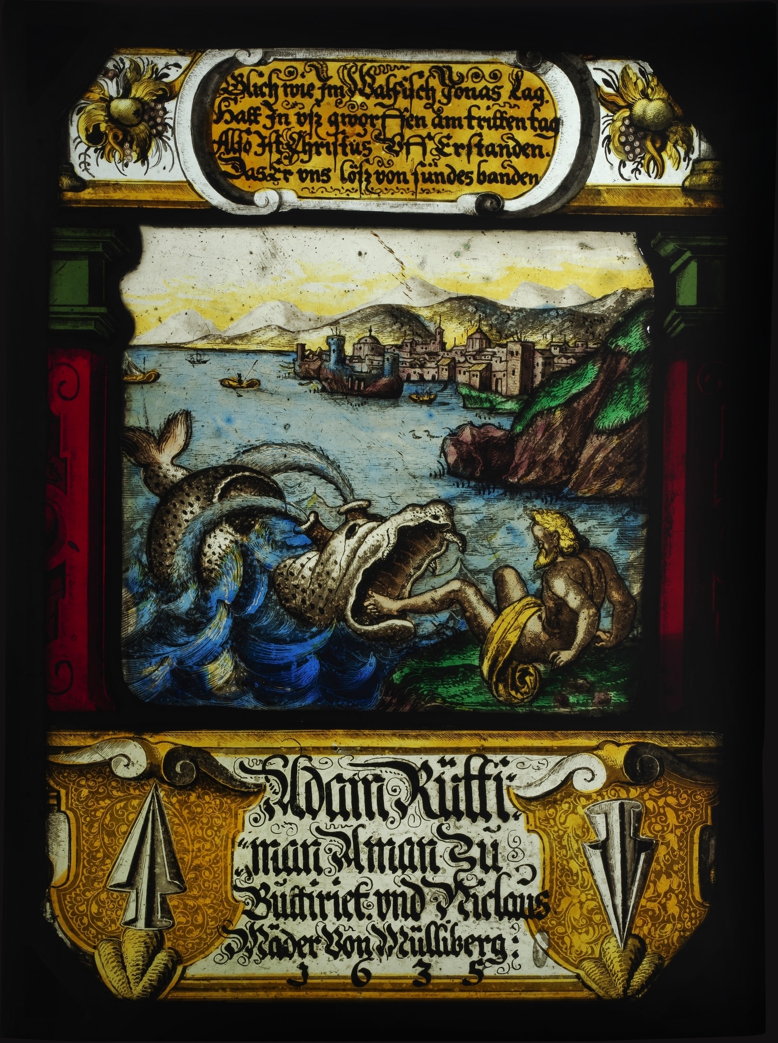 Vitrail aux armes d’Adam Rüttimann et de Niklaus Mäder avec Jonas rejeté par la baleine