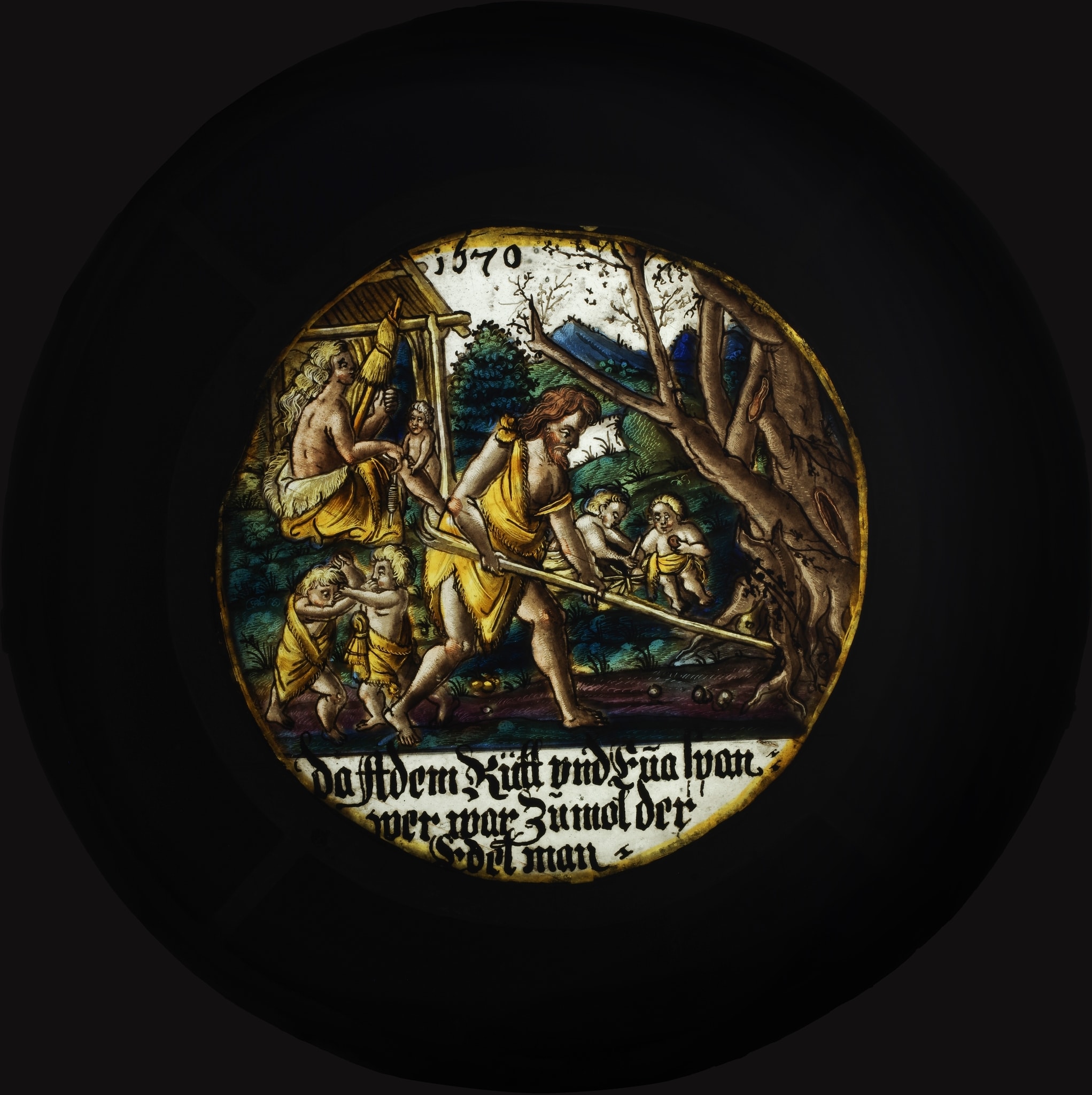 Les petits médaillons monolithes circulaires avec des scènes religieuses exemptes d’armoiries ne sont pas rares en Suisse au milieu du XVIIe siècle. Tout comme le présent vitrail, ces médaillons représentent dans la partie centrale un épisode biblique, tandis qu’une inscription relative à la scène est inscrite au-dessous, sur le verre resté blanc. Alors que certains médaillons relatent des histoires bien connues, par exemple le sacrifice d’Isaac (TG_187), d’autres représentent des épisodes plus inhabituels, comme la lutte de Jacob avec l’ange (TG_1795). La représentation d’Adam et Eve au travail en fait partie et n’occupe généralement qu’une place secondaire sur les vitraux, à l’instar du panneau de 1698 du peintre verrier de Zofingen Johann Jacob Müller (1660-1712) qui laisse avant tout la place aux armes des donateurs (FR_402).