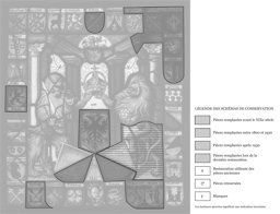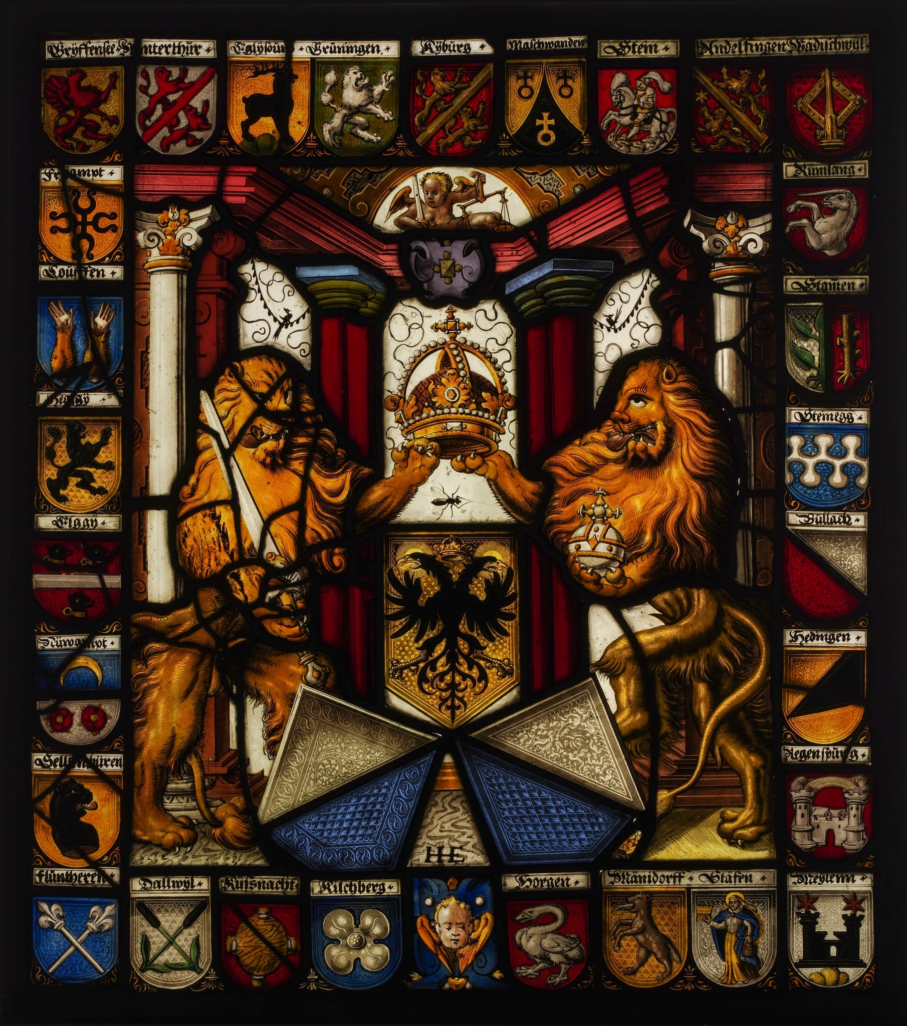 Vitrail rectangulaire représentant au centre, devant un portique composé de colonnes soutenant une architrave sur laquelle repose un angelot tenant un glaive et une balance, trois écus aux armes de Zurich et du Saint-Empire présentés en pyramide, surmontés d’une couronne et flanqués de deux lions héraldiques en pied, dont celui de gauche porte un glaive et celui de droite un orbe crucifère. Une mouche en trompe-l’oeil est peinte sous la couronne. Autour de la composition centrale, vingt-neuf écussons aux armes de communes zurichoises, sont répartis dans l’ordre suivant : Greifensee, Winterthur, Eglisau, Grüningen, Kyburg, Maschwanden, Stein, Andelfingen, Wädenswil, Rümlang, Stammheim, Steinegg, Bülach, Hedingen, Regensberg, Meilen, Stäfa, Männedorf, Horgen, Kilchberg, Küsnacht, Thalwil, Fluntern, Sellenbüren, Neumatt, Elgg, Laufen, Freiamt.