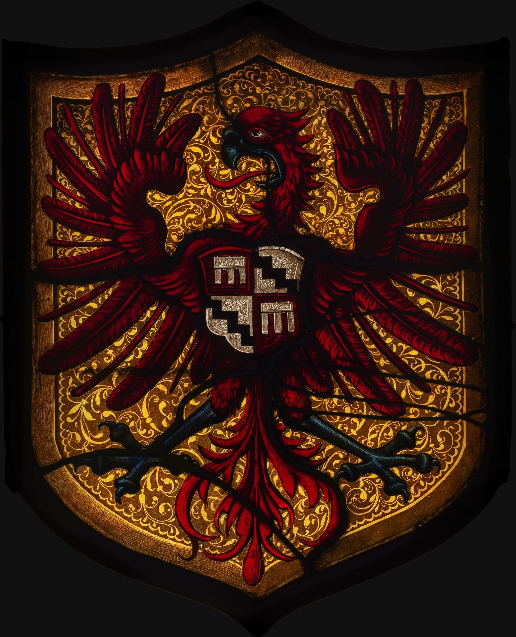 Il a la forme d’un écusson et présente un aigle les ailes ouvertes au centre duquel sont figurées des armoiries non identifiées. Sa taille plutôt grande pour des armoiries nous permet de dire qu’il n’est certainement pas le fragment d’un vitrail héraldique.