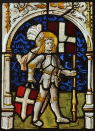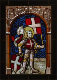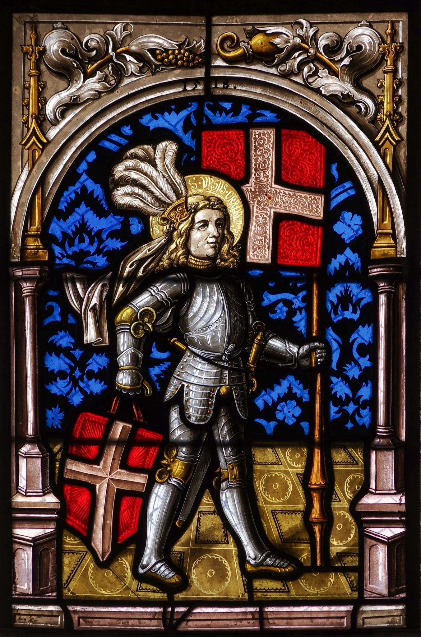 Saint Ours de Soleure, aux cheveux blonds ondulés, se tient devant un fond damassé bleu sur un sol carrelé jaune. Vêtu d'une armure complète bleu acier avec des ferrures dorées, il porte un nimbe doré et autour du front un bandeau de zibeline avec un plumet. Il tient dans ses mains son blason et sa bannière avec la croix d'argent en rouge. Armé d'une épée, il se situe sous un arc en plein cintre de style gothique tardif, orné de deux écoinçons jaunes et de feuillages, sur lequel est inscrite la date de 1518.