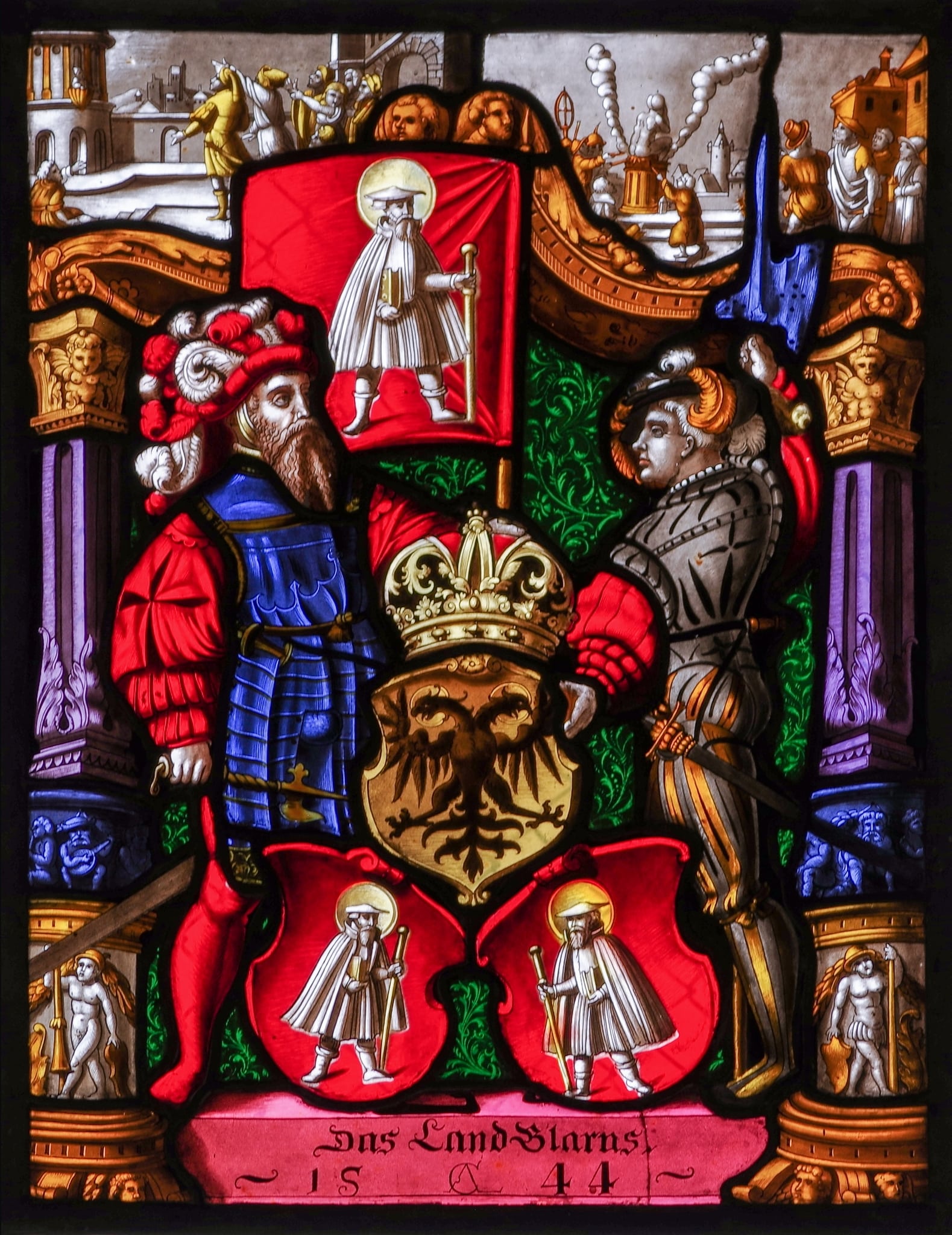 Pour la partie centrale du vitrail, Müller fait un changement d’armoiries, remplaçant les écussons de Schaffhouse (également présents sur le vitrail du XVIe siècle) par ceux de Glaris. Les autres changements de détails sont insignifiants.