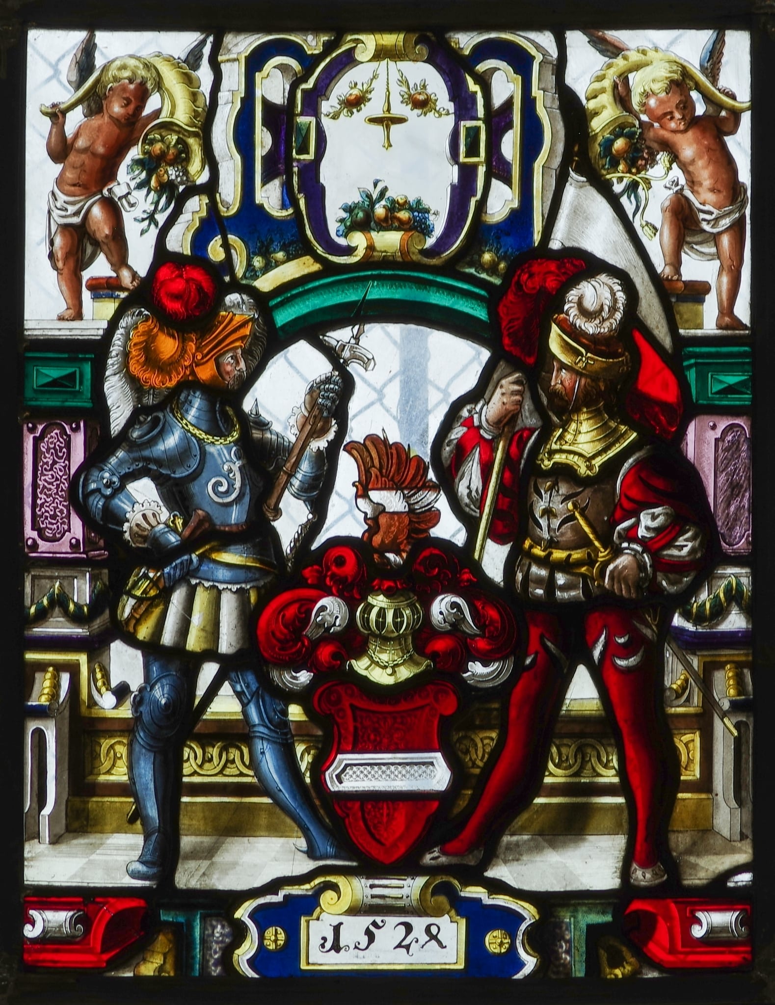 Deux soldats se tiennent devant un arc surbaissé de part et d’autre d’armoiries surmontées d’un heaume à lambrequins et d’un cimier formé de deux ailes reprenant les coloris des armoiries. A gauche, l’homme en armure, tient un marteau d’armes de sa main droite et porte un poignard suisse à sa ceinture. Celui de gauche, porte un étendard et une épée à sa taille. Tous deux sont coiffés d’un couvre-chef à plumes. Au sommet, deux putti tiennent une corne d’abondance au-dessus de leur tête, chargée de fruits et de végétaux, un pied posé sur un piédestal. En bas la date “1528” est présentée dans un cartouche.