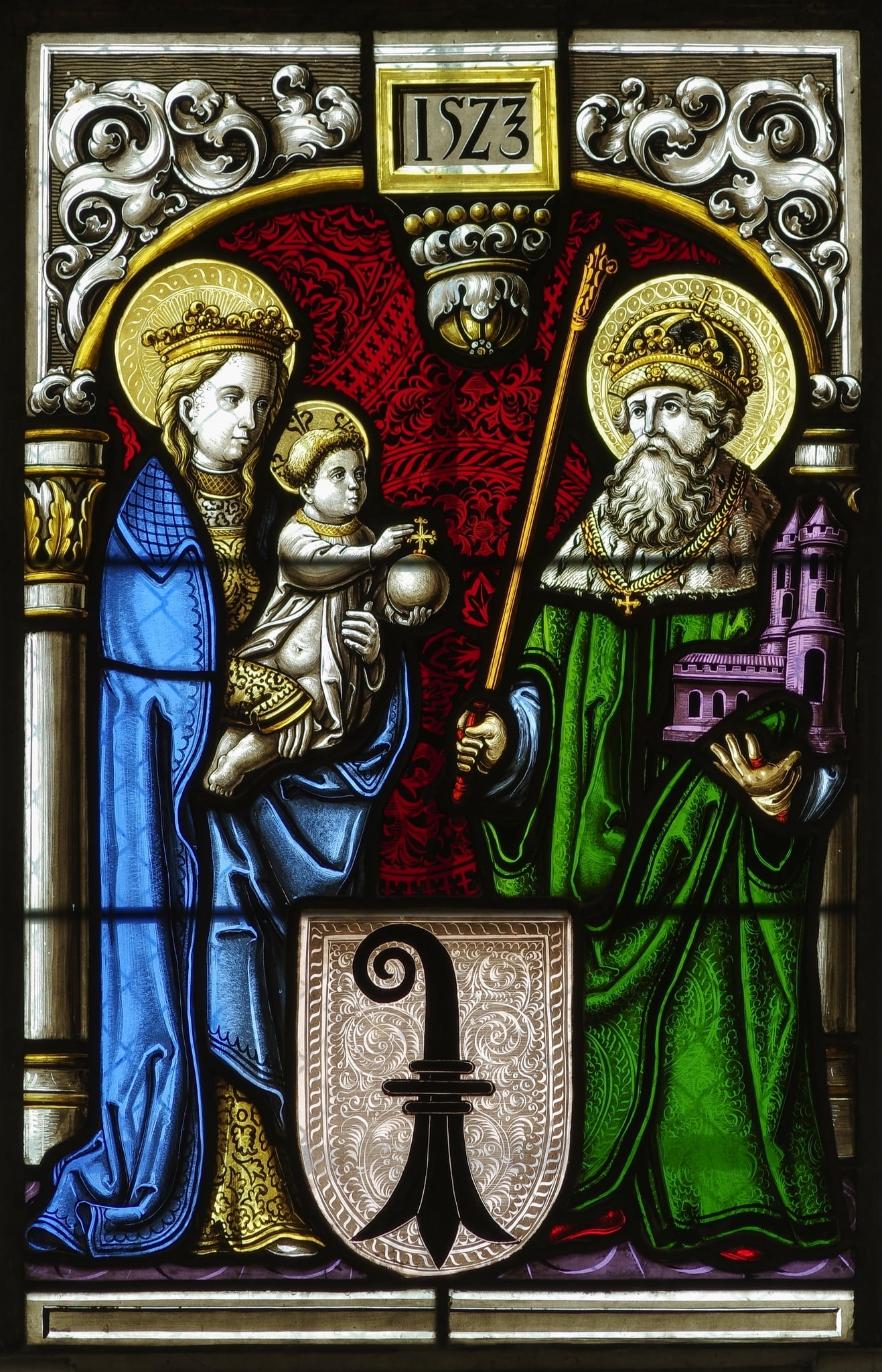 Vitrail aux armes de Bâle-Ville avec la Vierge à l'Enfant et l’empereur Henri II
